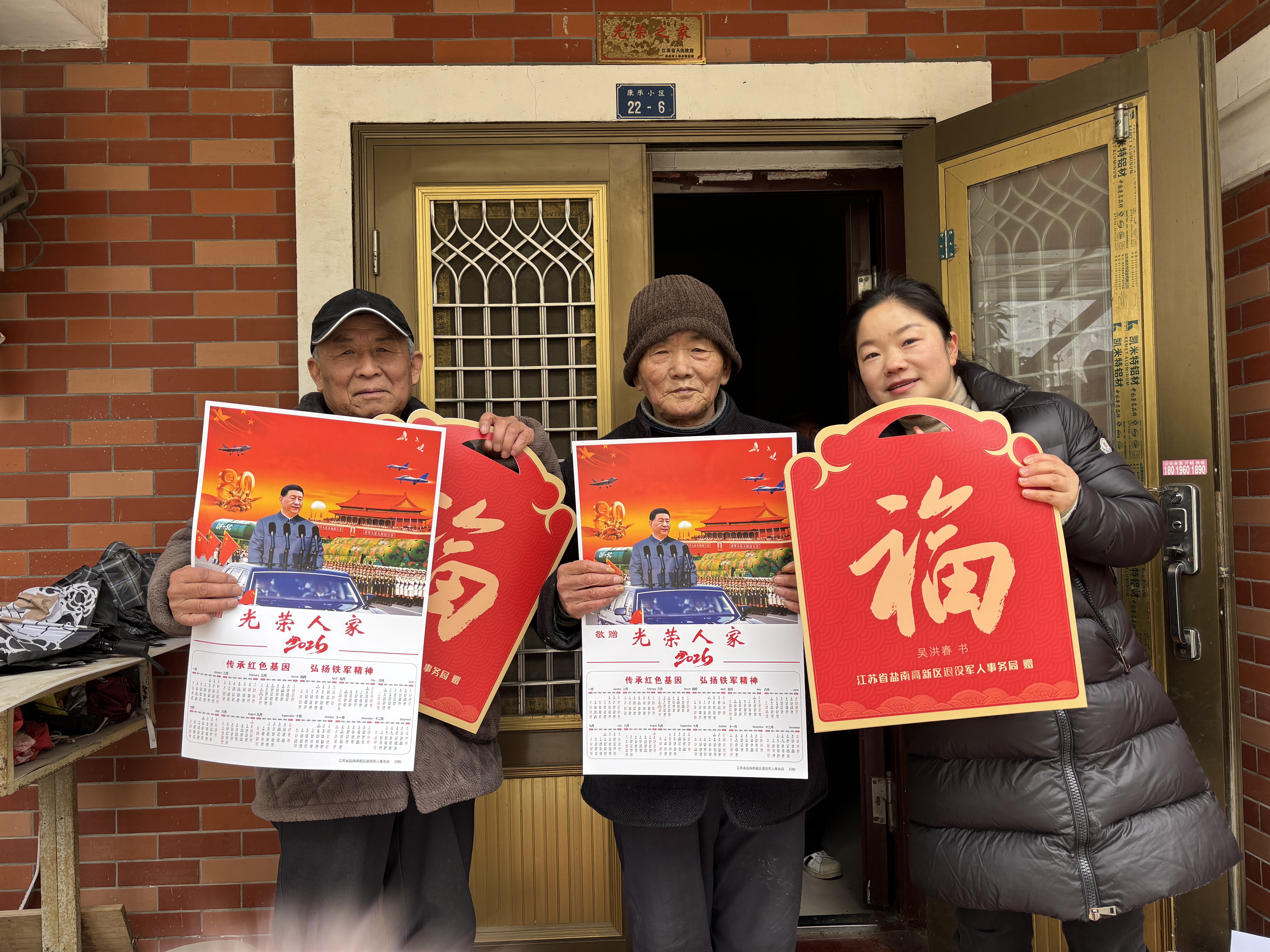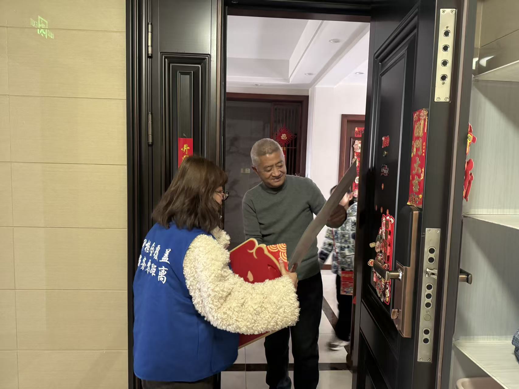 2月10日,盐南高新区科城街道民富社区开展“新春送对联、情暖光荣户”走访慰问活动,走访退役军人、伤残军人、带病回乡退役军人、烈士子女等优抚对象,送上大红春联、吉祥福字与新春祝福。在马年新春佳节来临之际,弘扬拥军优属光荣传统,切实把党和政府的关怀与温暖送到退役军人及优抚对象心坎上。