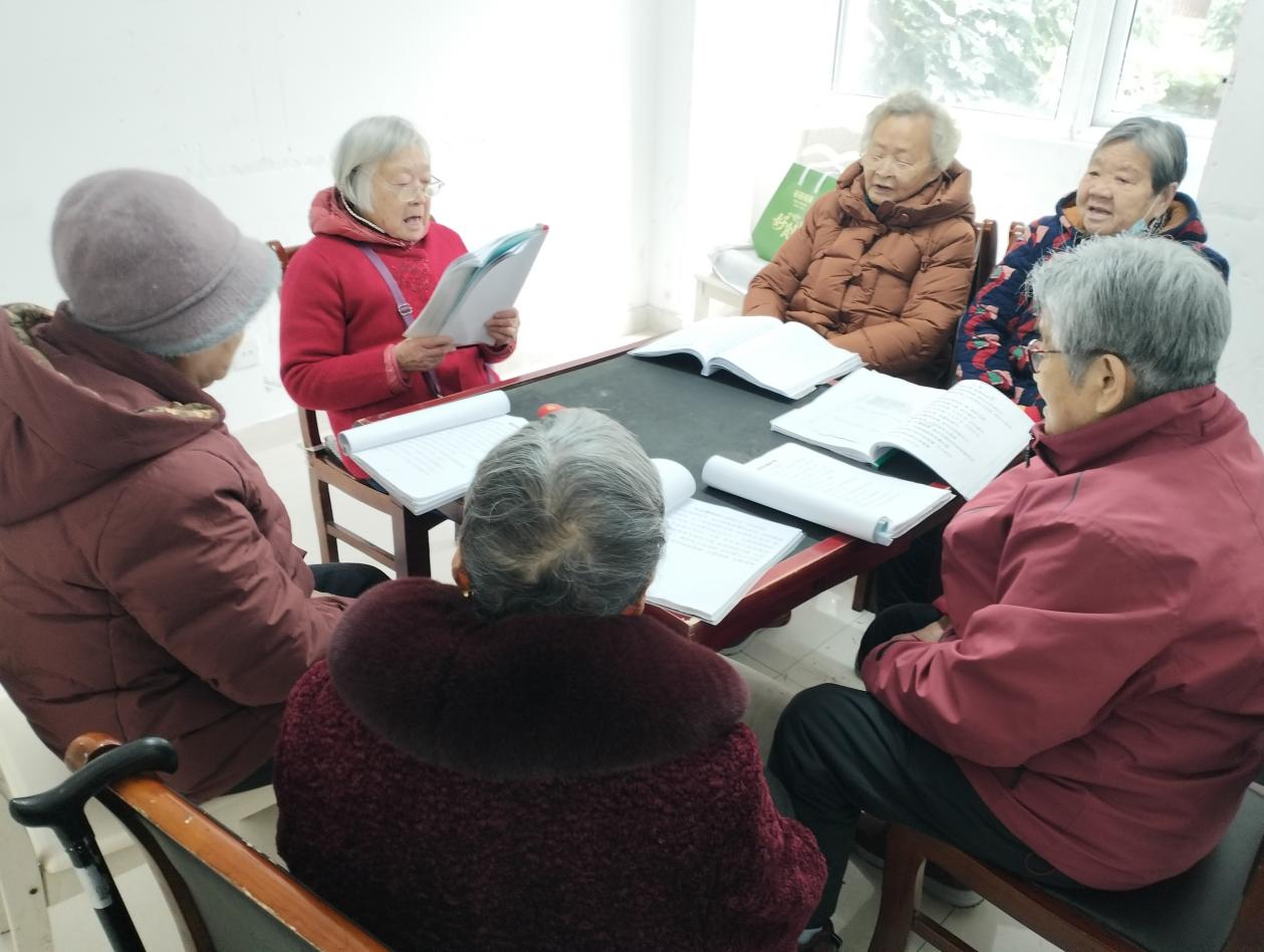 “党啊党啊亲爱的党啊/你就像妈妈一样/把我培养大/教育我爱祖国/鼓励我学文化/幸福的明天在向我招手/四化美景你描画……”2月27日早晨,天气阴沉,然而,盐南高新区新河街道海嘉社区中海凯旋门南区活动室里歌声悠扬,暖意融融。6位头发花白的老太太,每人手捧歌词本,围坐在桌旁一起放声歌唱,脸上荡漾着幸福温暖的笑容。