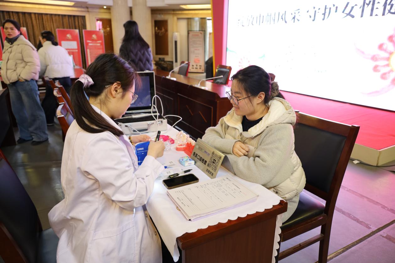 讲座结束后,备受期待的现场义诊服务有序展开。在倍美口腔的咨询台前,专业医生耐心细致地为每一位前来咨询的女职工进行口腔基础检查,利用专业工具仔细评估牙齿、牙周及口腔黏膜的健康状况,并针对个人情况提供个性化的治疗建议和日常维护指导。隔壁的榕昱堂中医馆诊台前同样排起了小队。中医专家通过望、闻、问、切传统诊疗方法,为女职工们把脉问诊,辨识体质,解答关于失眠、疲劳综合症等常见女性健康问题的困惑,同时提供了肩颈按摩服务,让现场女职工放松身心。女职工们表示,“今天的活动真是太贴心了,不仅学到了知识,还免费做了检查,让我们感受到了街道妇联‘娘家人’的温暖。”