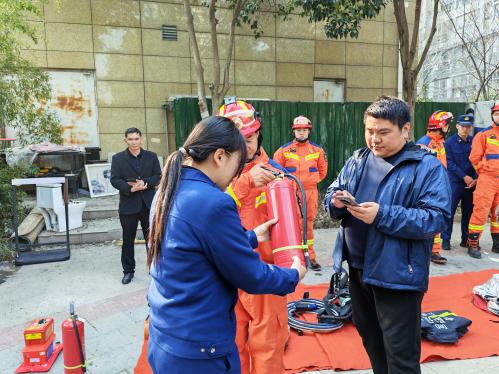 理论讲解结束后,消防员开展了消防器材实地教学,现场摆放灭火器、防毒面具等常用器材,逐一介绍其功能、适用场景与检查维护方法,手把手示范灭火器“提、拔、握、压”的使用要领,并耐心解答居民的消防疑问。为增强沉浸式体验,现场还准备了抢险救援服供居民试穿,网格员全程有序引导、协助调整装备,让居民在亲身体验中感受消防员的工作日常,提升应急处置的实操能力。