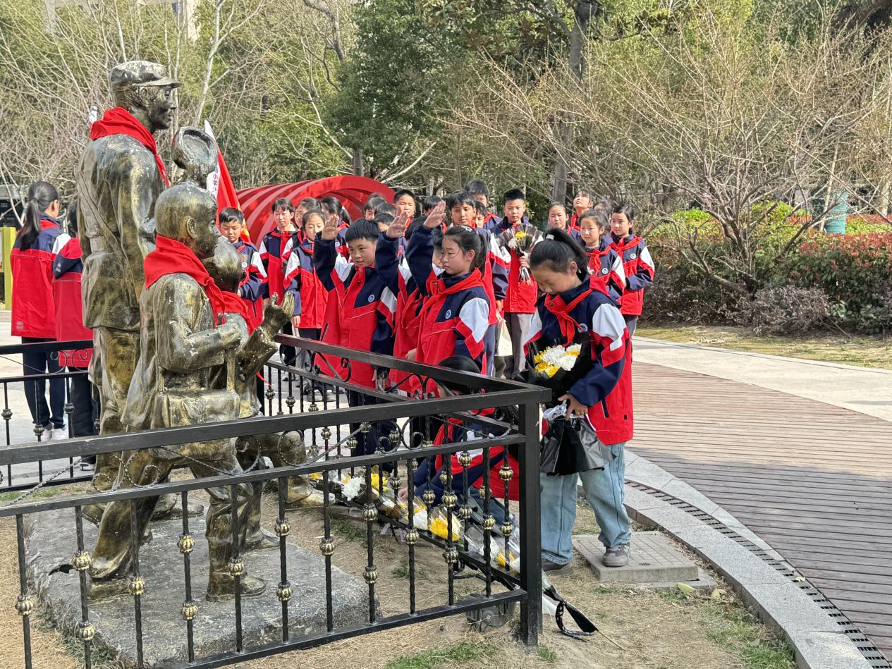 活动开始,全体人员整齐列队,神情肃穆,面向王裕新烈士雕像肃立默哀,表达对革命先烈的深切缅怀与崇高敬意。默哀毕,少先队员们整齐列队,郑重地将鲜艳的红领巾佩戴整齐,向烈士雕像敬献鲜花,一朵朵洁白、明艳的鲜花寄托着对先烈的追思与敬仰,象征着先烈精神永垂不朽。随后,社区宣讲员为在场师生深情讲述王裕新烈士的英勇事迹,让在场所有人深刻感受到革命先烈不畏强敌、舍生取义的崇高精神,现场师生无不深受触动,内心满是敬佩。