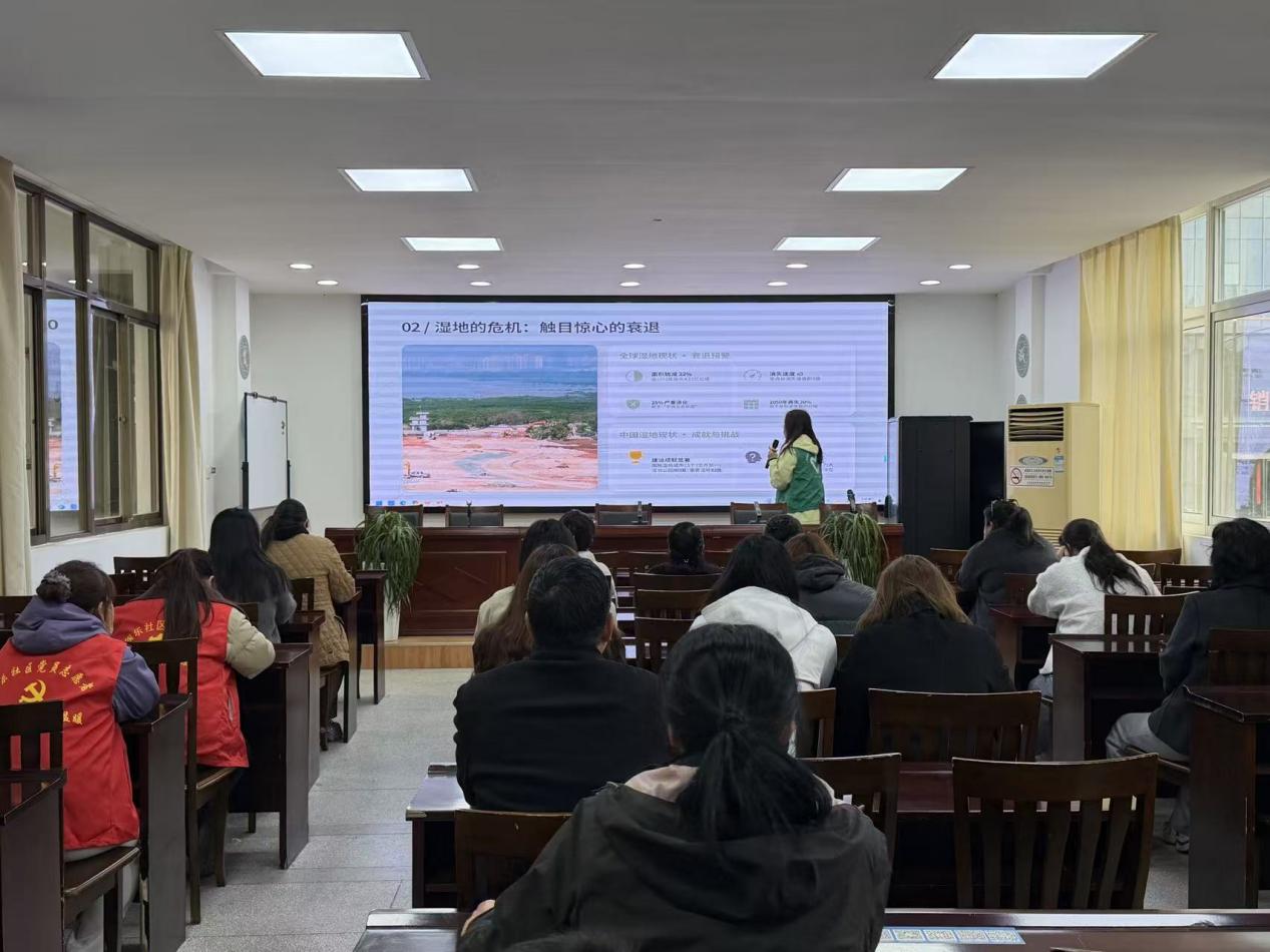 活动现场,盐城师范学院湿地学院的学生志愿者担任宣讲员,围绕“认识湿地、湿地危机、守护湿地”三大板块展开讲解。志愿者结合PPT内容,用通俗语言阐释湿地定义、分类与核心特征,重点介绍湿地“地球之肾”“物种基因库”“天然蓄水库”“碳汇库”四大生态功能,让居民直观了解湿地不可替代的价值。宣讲还剖析了全球湿地面积锐减、污染加剧、物种入侵等严峻危机,结合盐城黄(渤)海候鸟栖息地世界自然遗产保护实践,分享本地湿地保护成效与行动路径,引导大家从节水、减塑、文明观鸟等小事践行保护责任。