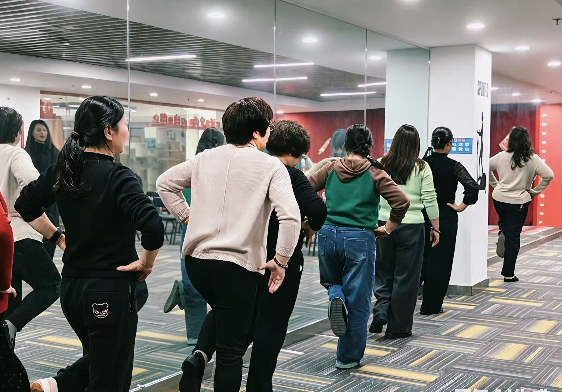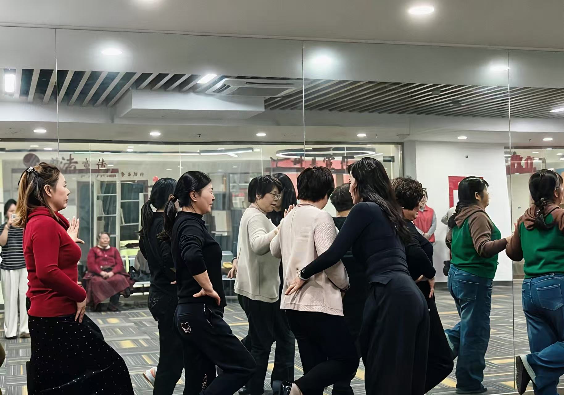 走进该社区三楼温馨的文化空间,灯光柔和。该社区党总支书记裴增浩表示:“希望通过细节设计,让居民从踏入空间的那一刻起,就感受到被关怀的温暖。”专业舞蹈老师以基础拉伸为核心内容,带领居民从肩颈放松到全身舒展,逐步进入舞蹈状态。针对零基础学员,老师采用“分解动作+趣味口诀”的教学方式,将复杂的舞步转化为“一步一拍,转身微笑”的简单指令,居民们手拉手练习时,教室中不时响起热烈的掌声和欢快的笑声。