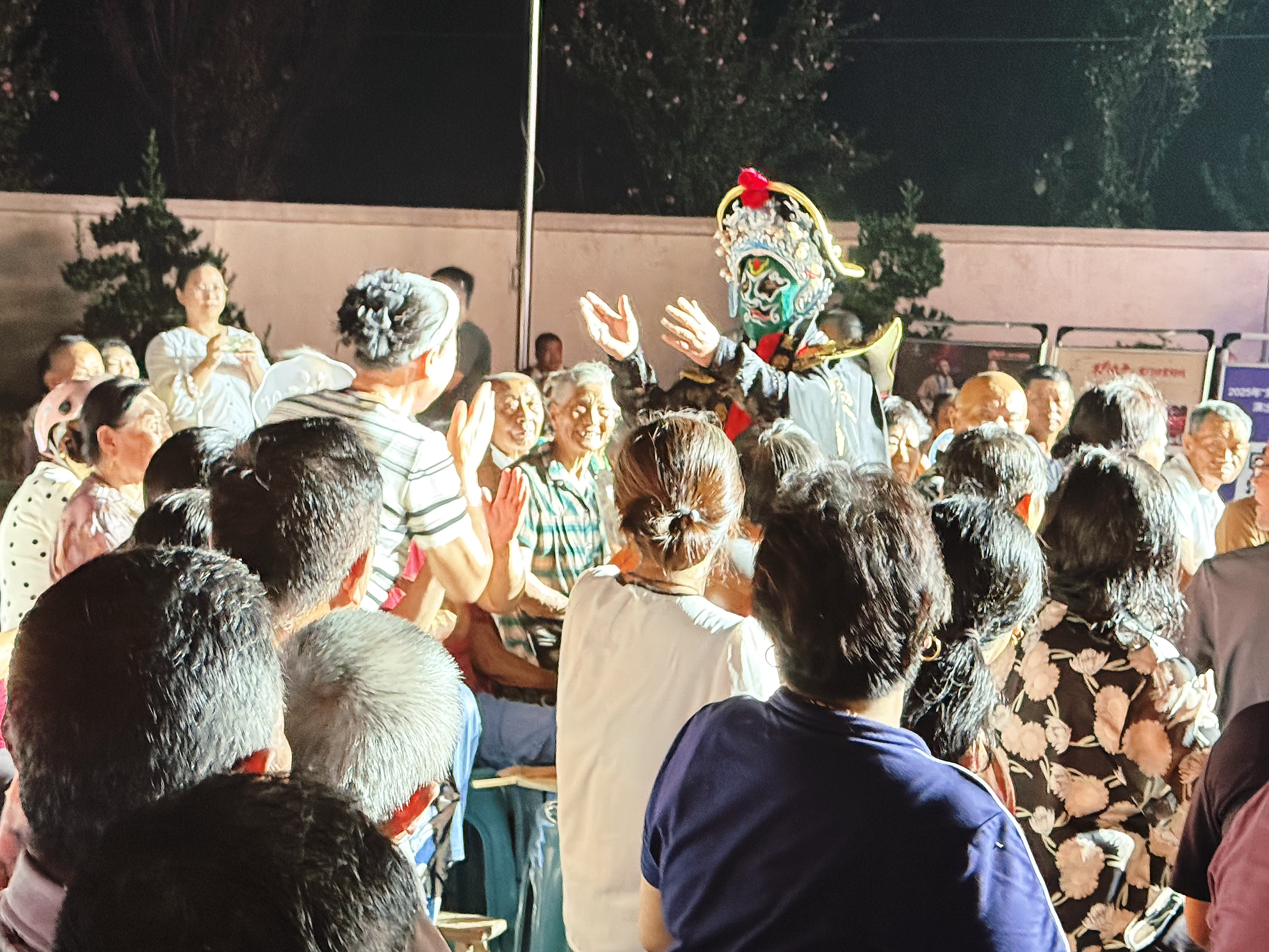 曲艺《变脸》随后登场,表演者手法娴熟,红、绿、白、黑脸谱在抬手转头间快速切换。小朋友瞪大双眼、小嘴成“O”型,不时发出“哇”的惊叹,拉着家长追问:“叔叔怎么变得?太神奇了!”这门曾亮相首届中德文化艺术节的传统艺术,在乡村舞台绽放别样光彩。