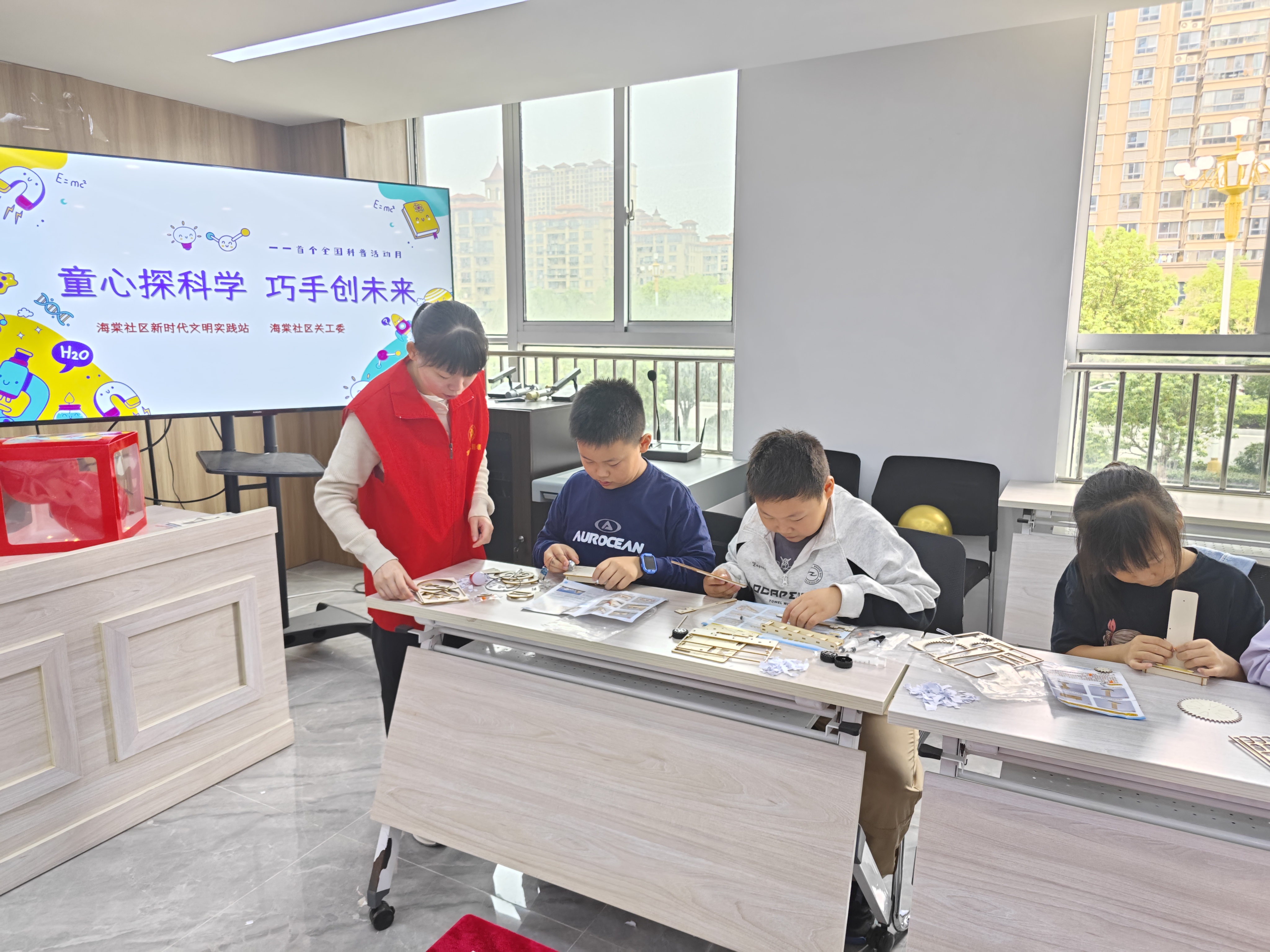 在科学手工制作环节,海棠社区精心准备了手动发电机、太阳能小车等十余种材料包。孩子们在老师和志愿者的指导下动手操作,有的专注地拧着螺丝,有的小心翼翼地粘贴零件,遇到难题时互相帮忙,欢声笑语中,一个个充满创意的作品逐渐成形。