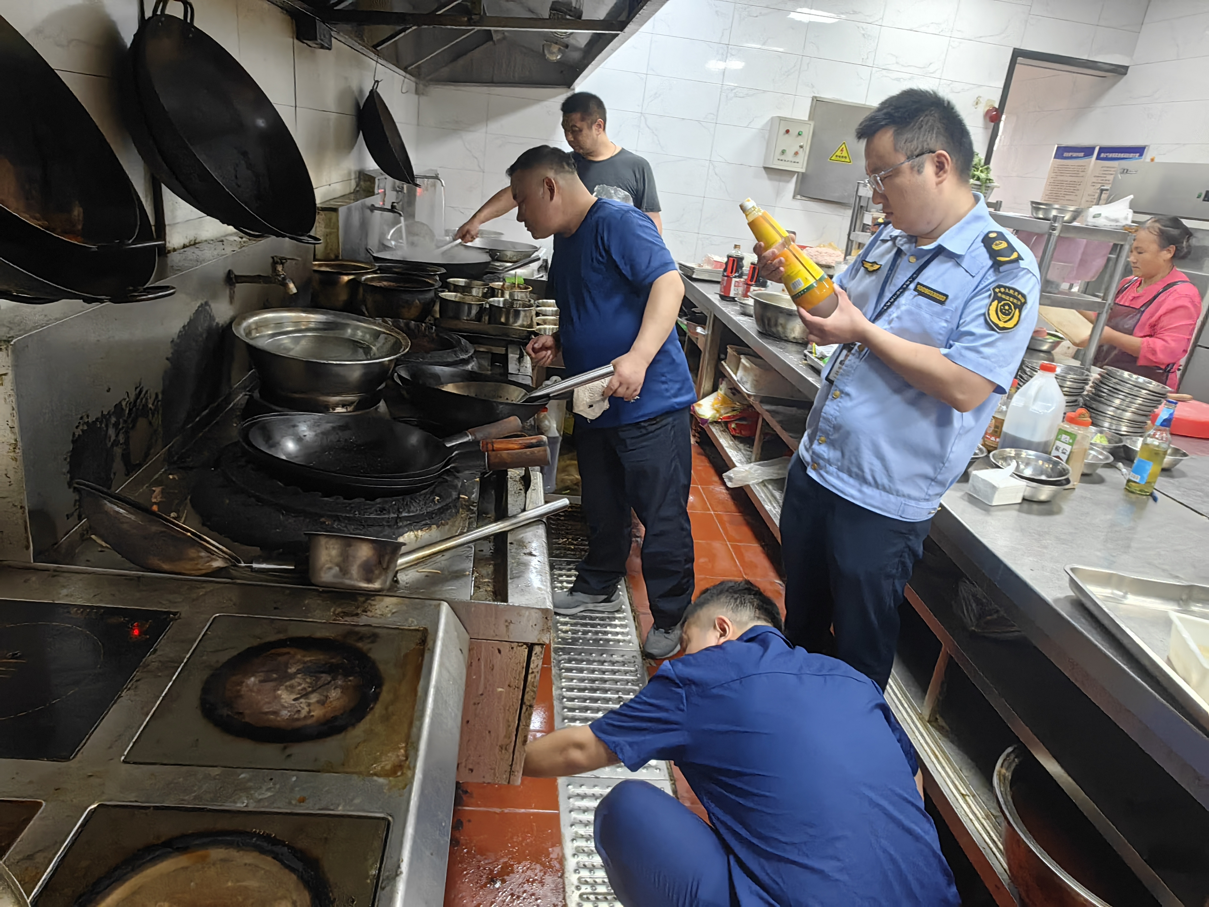 联合检查组来到辖区一家大酒店,直奔后厨“重地”,查看地面灶台是否干净整洁、刀具砧板是否生熟分开及是否标注专用标识、生熟食材是否分开存放、是否使用变质食材、厨师是否持有健康证上岗、液蜡燃料是否有检测报告、油箱外侧有无堆放可燃物体等,守住消费者“舌尖安全”。
