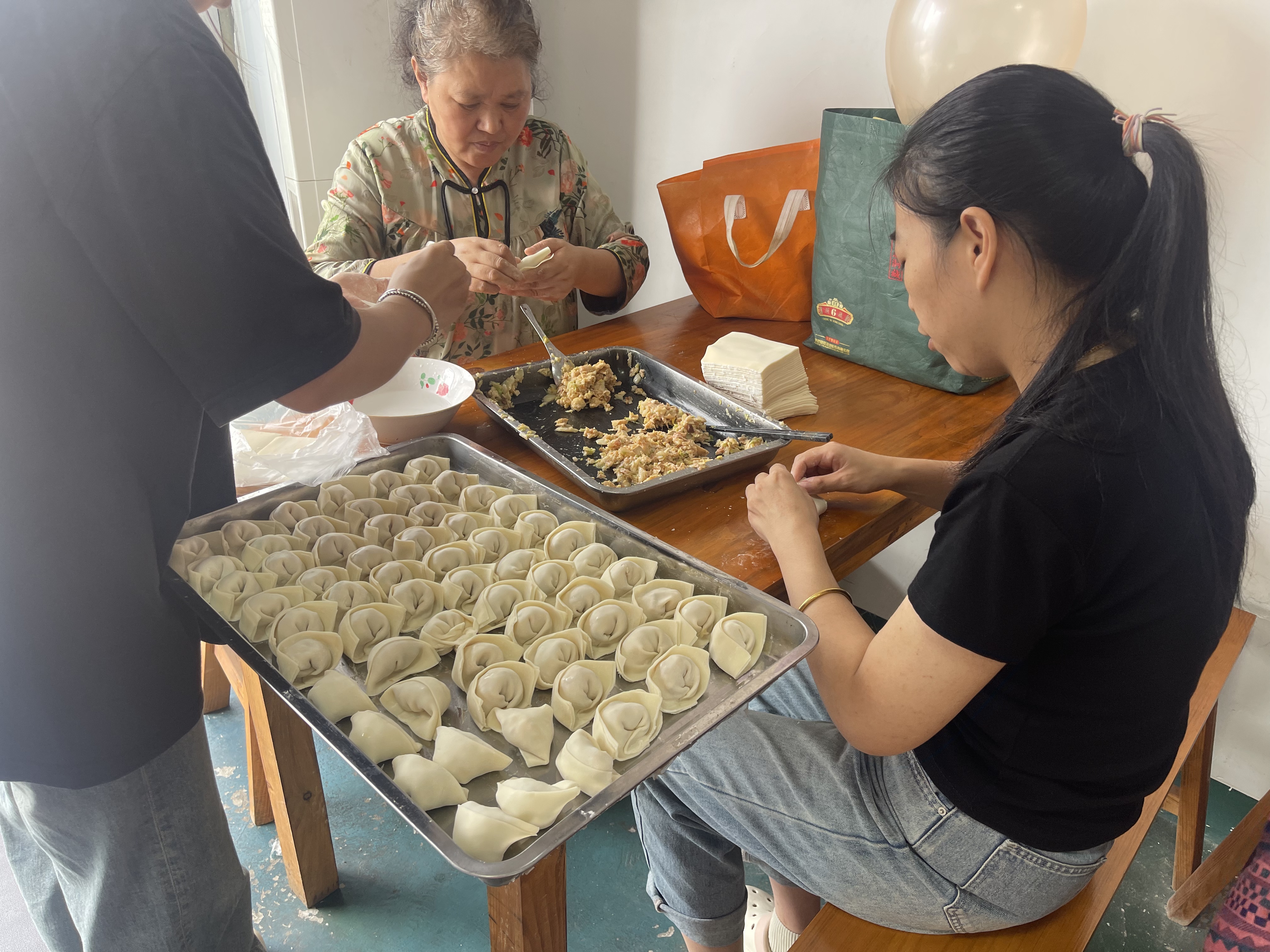 演出结束后进入包饺子环节,工作人员提前准备好了面粉、馅料、擀面杖等食材和工具,村民们自发分成几个小组,有的揉面、有的擀皮、有的包饺子,大家分工协作、默契配合。不一会儿,一排排形态各异的饺子就摆满了托盘,每一个小小的饺子都承载着大家对团圆的美好期许。热气腾腾的饺子就端上了桌,村民们围坐在一起品尝,不仅分享着美食,也分享着生活中的大小趣事,现场欢声笑语不断。