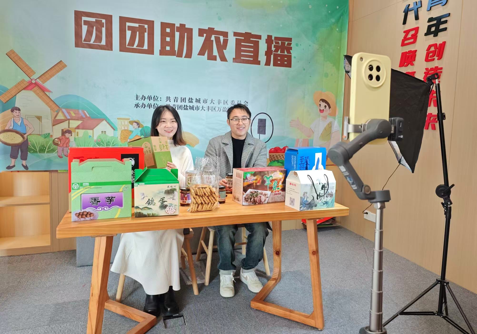 11月21日,由共青团盐城市大丰区委员会主办、共青团万盈镇委员会承办的“团团助农”直播活动准时开播,为万盈镇优质农产品架起一座通往全国市场的“线上金桥”。