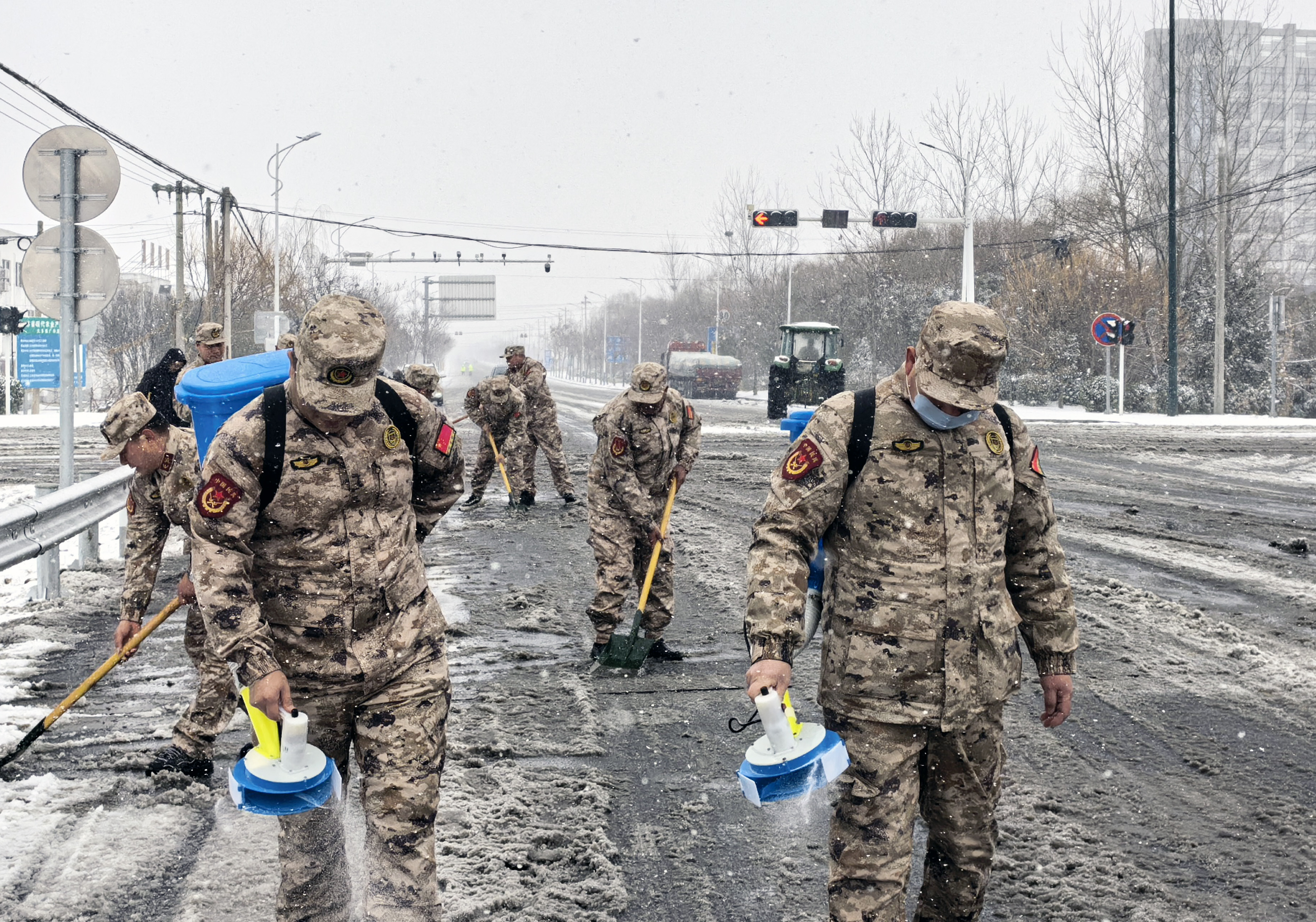 万盈镇基层人民武装部组织民兵,清晨六点便携带单兵融雪抛洒器等专业装备,对辖区学校、菜市场等重点区域及主干道、桥梁,展开系统性融雪除冰作业。他们手持器械,有序抛洒融雪剂,铁锹与冰面撞击的声音此起彼伏。在他们的带动下,周边群众纷纷主动加入扫雪除冰行列,沿街商铺业主、早起买菜的居民,甚至放假在家的学生,都拿起工具,协力清扫门前积雪及街道路面。