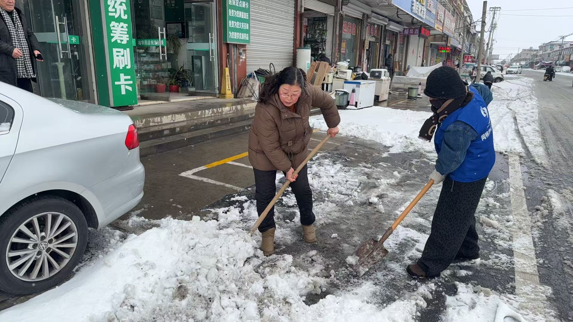 领导班子成员带队,与村(居)干部、社区工作者、志愿者、环卫工人迅速集结,组成多支扫雪小队,分赴辖区各主干道关键路段及重点场所。作业现场,大家手持铁锹、扫帚、雪铲、盐袋等工具,分工明确、协作默契。有的俯身挥锹,将路面积雪硬块奋力铲至路边;有的挥动扫帚,细致清扫路面残留积雪,确保路面无积雪残留、无清扫死角;有的手持盐袋,沿着结冰路段均匀撒播融雪盐,加速残留冰雪融化,防止路面二次结冰;还有的重点聚焦人行道、公交站台、学校周边等人员密集区域,有序铺设防滑草垫,同时耐心提醒过往行人减速慢行。凛冽的寒风中,大家不畏严寒、干劲十足,忙碌的身影构成了冬日里一道温暖的风景线。经过数小时奋战,辖区主干道积雪结冰已基本清除,交通通行秩序迅速恢复,为群众出行筑牢了“安全屏障”。
