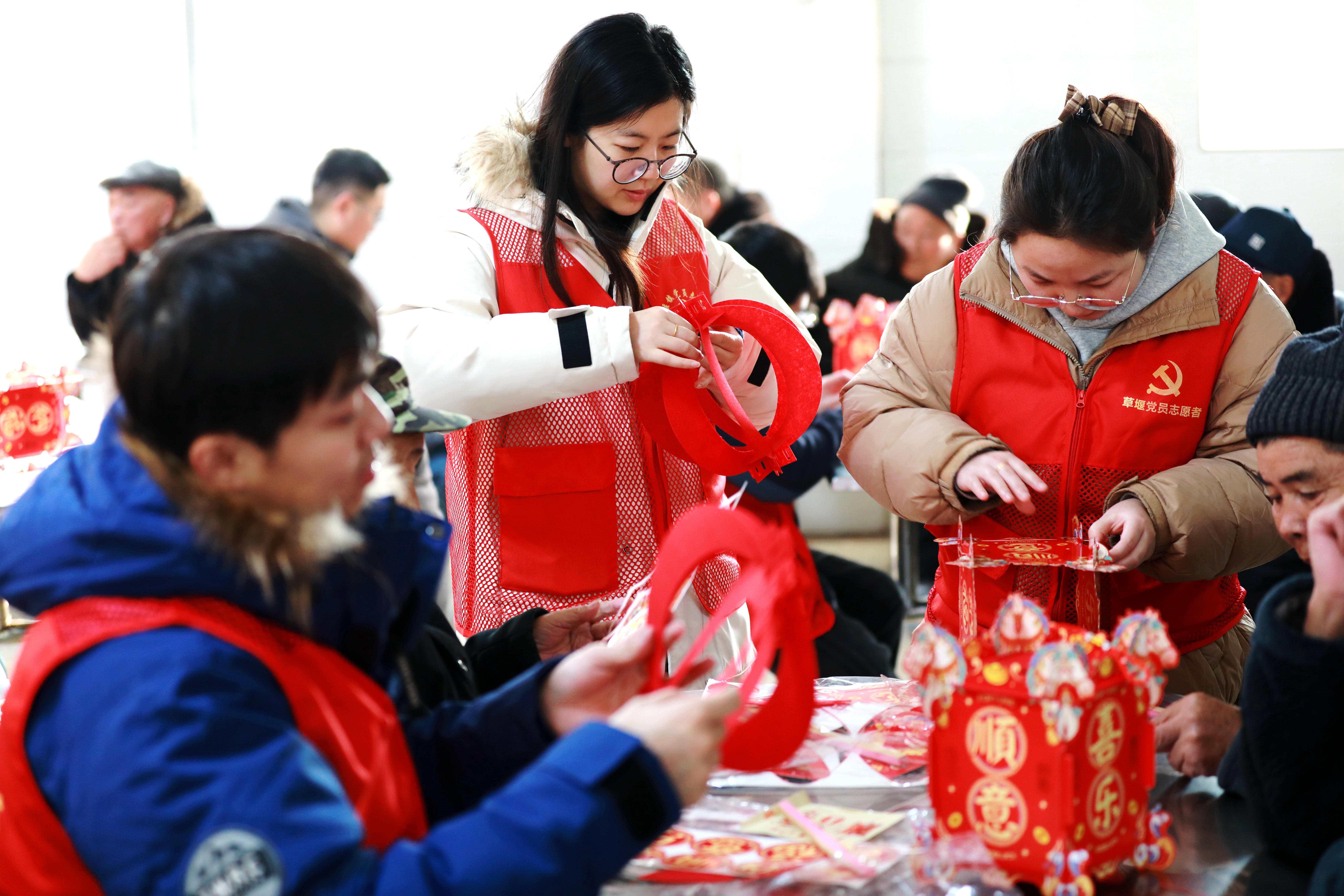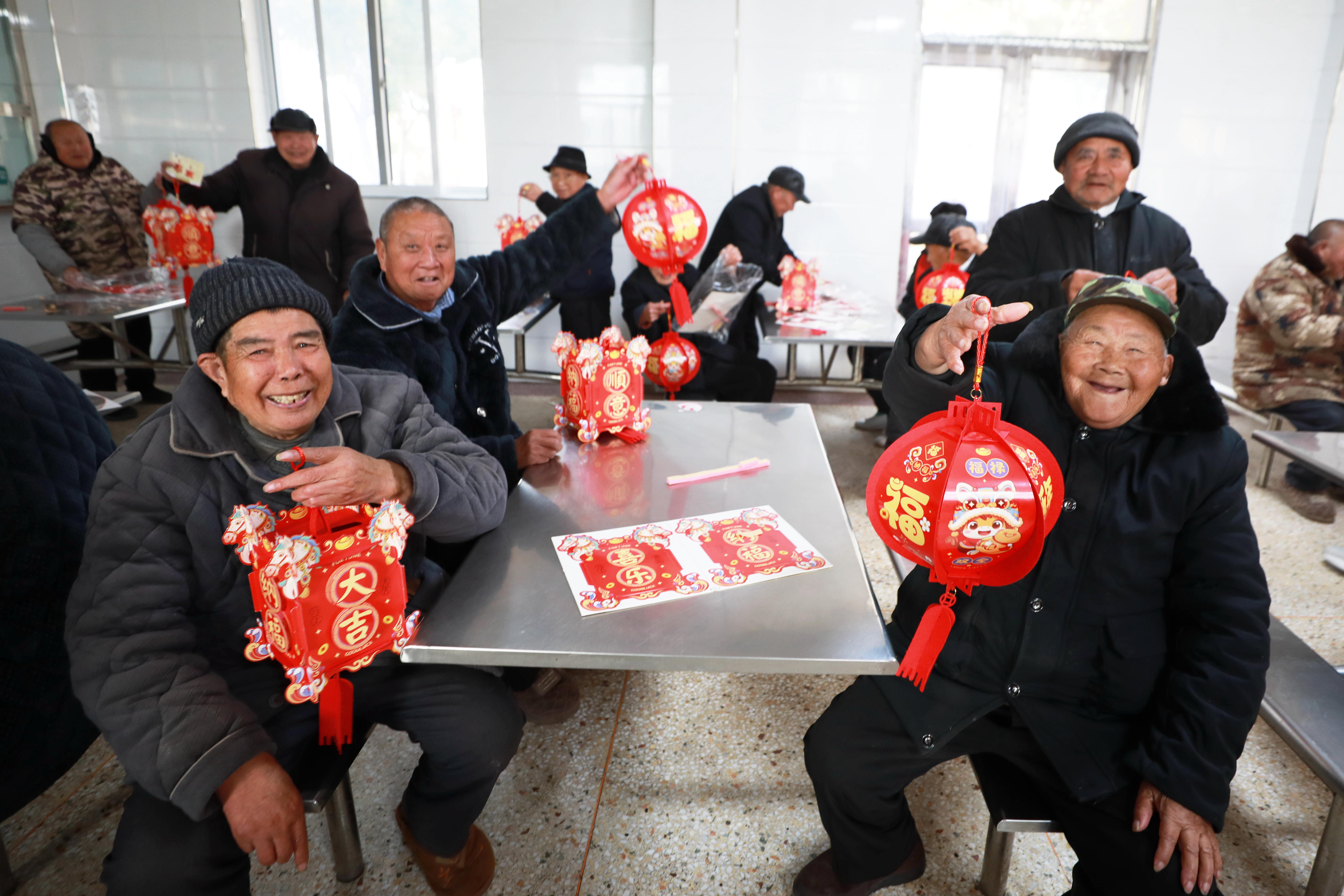 最热闹的环节当属灯笼制作。志愿者提前准备好红灯笼的组合材料,并耐心向老人们讲解制作步骤与技巧。老人们兴致勃勃地拿起材料,与年轻干部们分工协作、默契配合,折叠、拼装、装饰……一双双布满岁月痕迹的大手与一双双充满活力的小手相互配合,在欢声笑语中,原本零散的材料逐渐变成了一个个寓意吉祥的红灯笼。红彤彤的灯笼挂满活动现场,不仅为敬老院增添了浓厚的新春氛围,更象征着团圆与希望,让老人们在亲手创作的乐趣中感受到浓浓的节日暖意与关怀,把年味拉满。