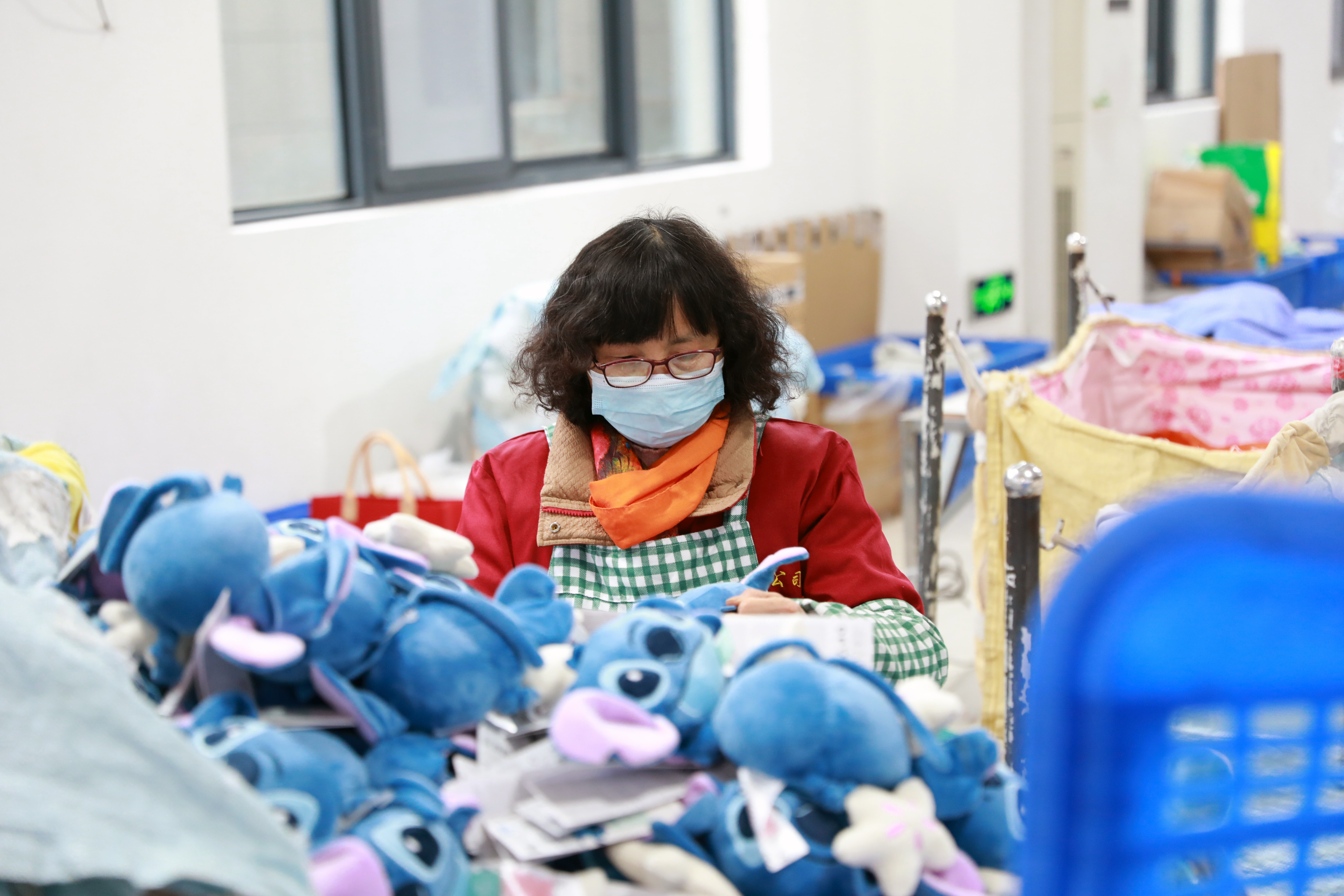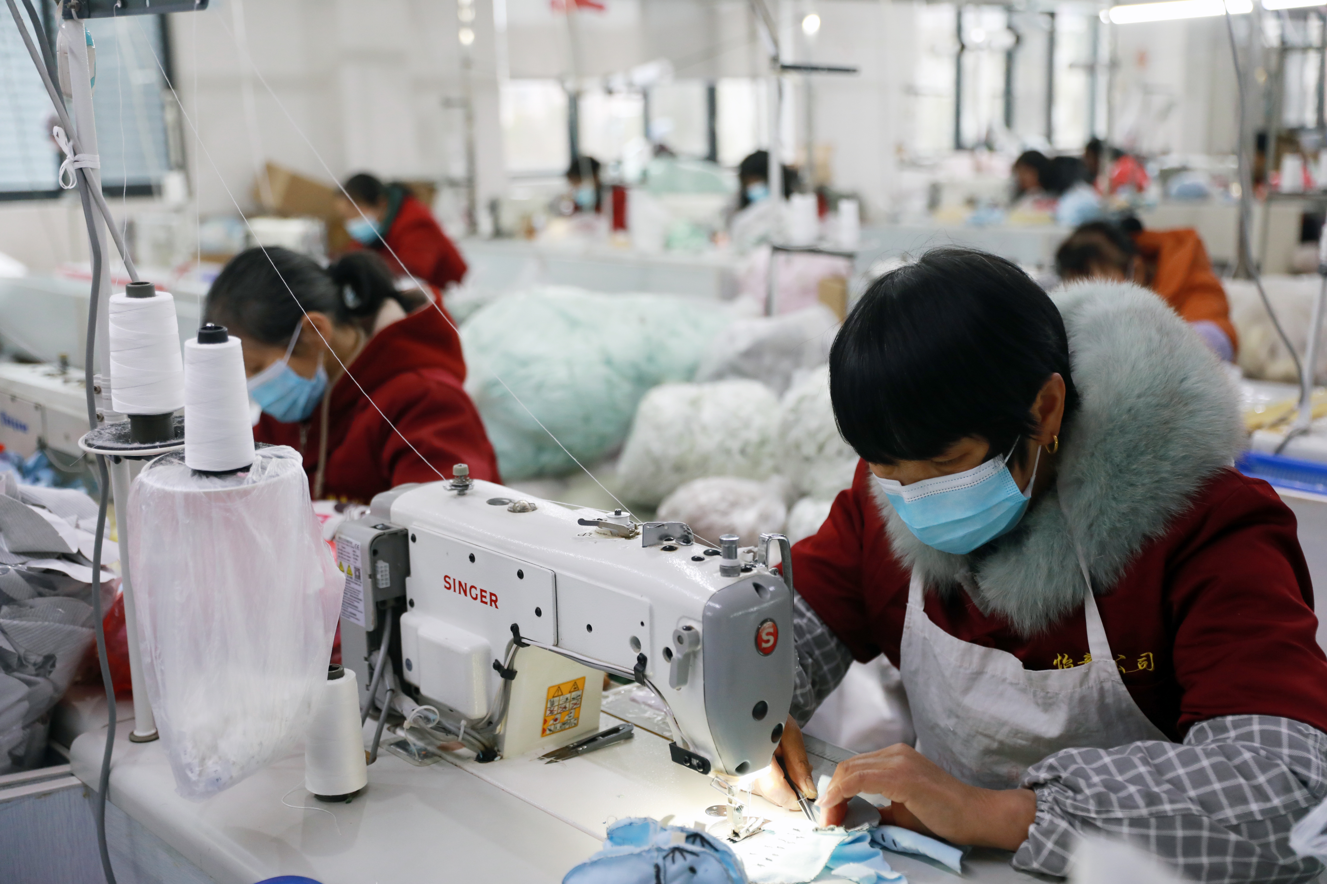 2月26日,位于大丰区白驹镇的盐城怡童家纺有限公司和盐城市鑫雅工艺品厂,工人正在赶制发往欧盟的毛绒玩具和床上用品。春节后,大丰区白驹镇多家玩具企业及早组织复工复产,努力实现外贸生产“开门红”。(董汝涛)