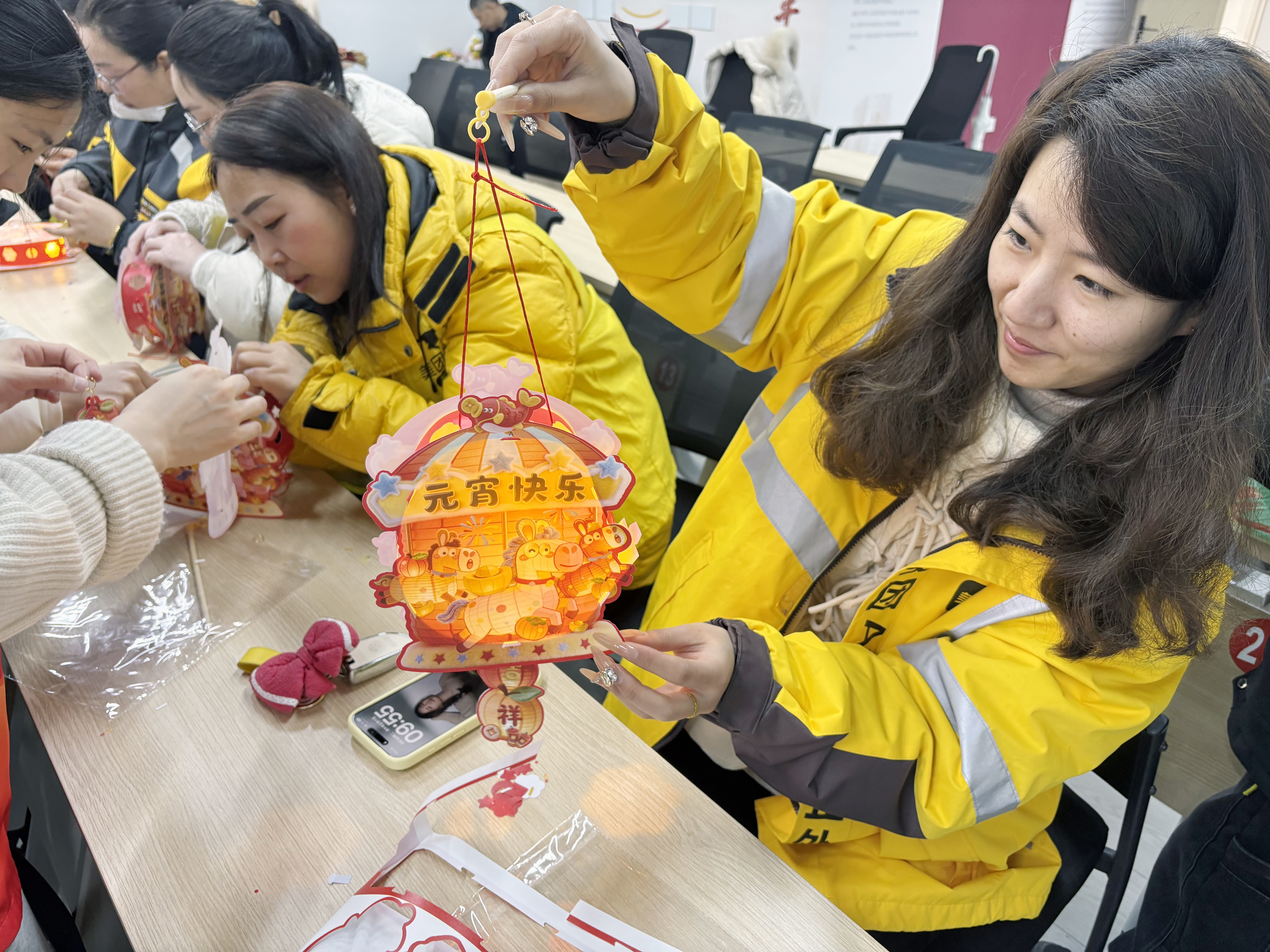 活动伊始,工作人员为大家生动讲解了元宵节的由来、赏花灯的传统习俗,并细致介绍了花灯制作的技巧与步骤。随后,参与者纷纷动手,投入到花灯创作之中——孩子们专注地裁剪彩纸、粘贴装饰,一步步完成属于自己的童趣花灯;女性劳动者们则耐心细致地组装构件,制作出一盏盏独具匠心的精美花灯。现场欢声笑语不断,洋溢着浓厚的节日氛围。
