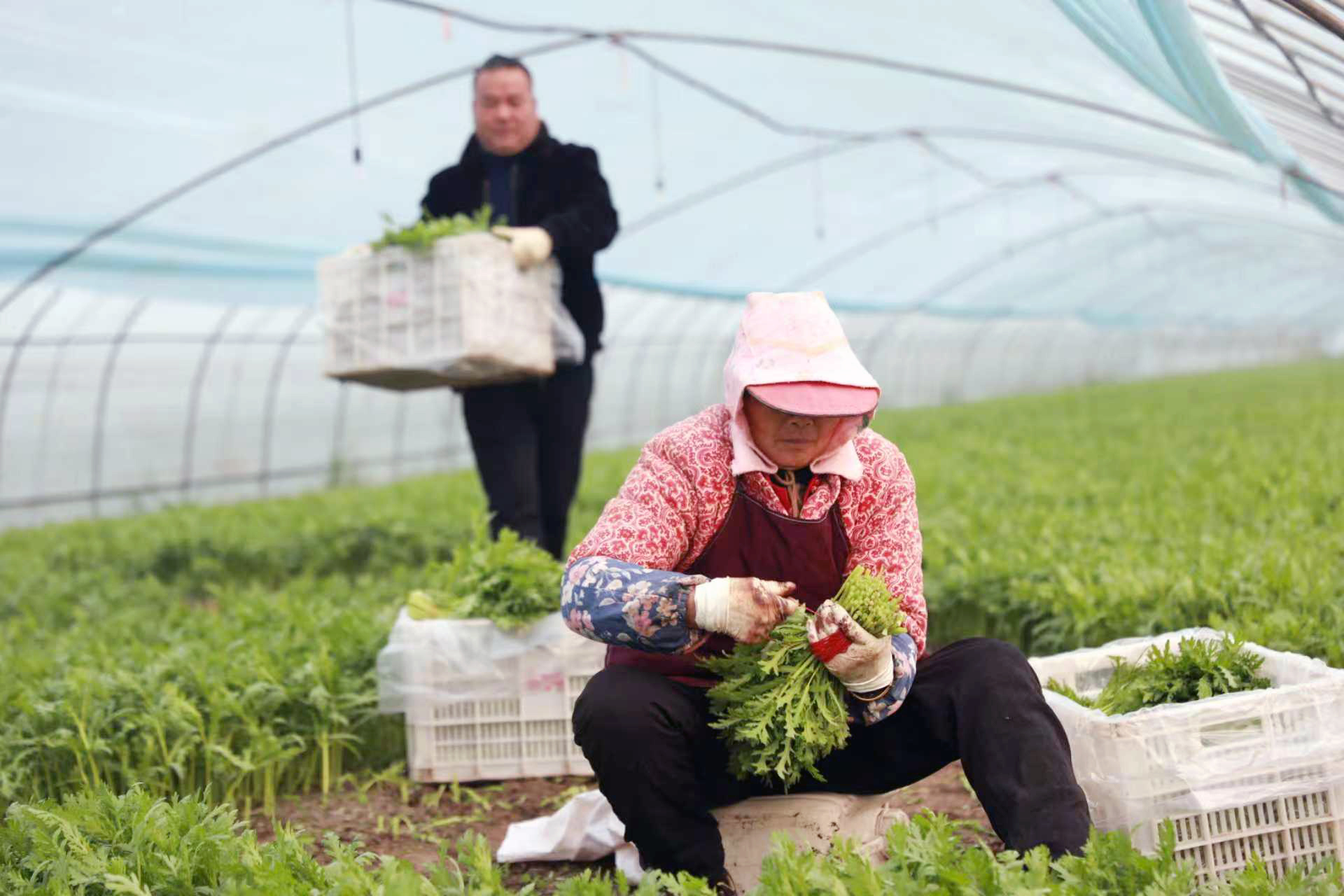 3月20日,大丰区权麒家庭农场,工人们正在采收茼蒿、菠菜、芹菜,准备供应市场。当日恰逢农历二十四节气的春分,意味着春季过半,春意渐浓。当地农民抢抓农时,适时抢种、抢收各类蔬菜,春耕生产全面展开。(董汝涛)