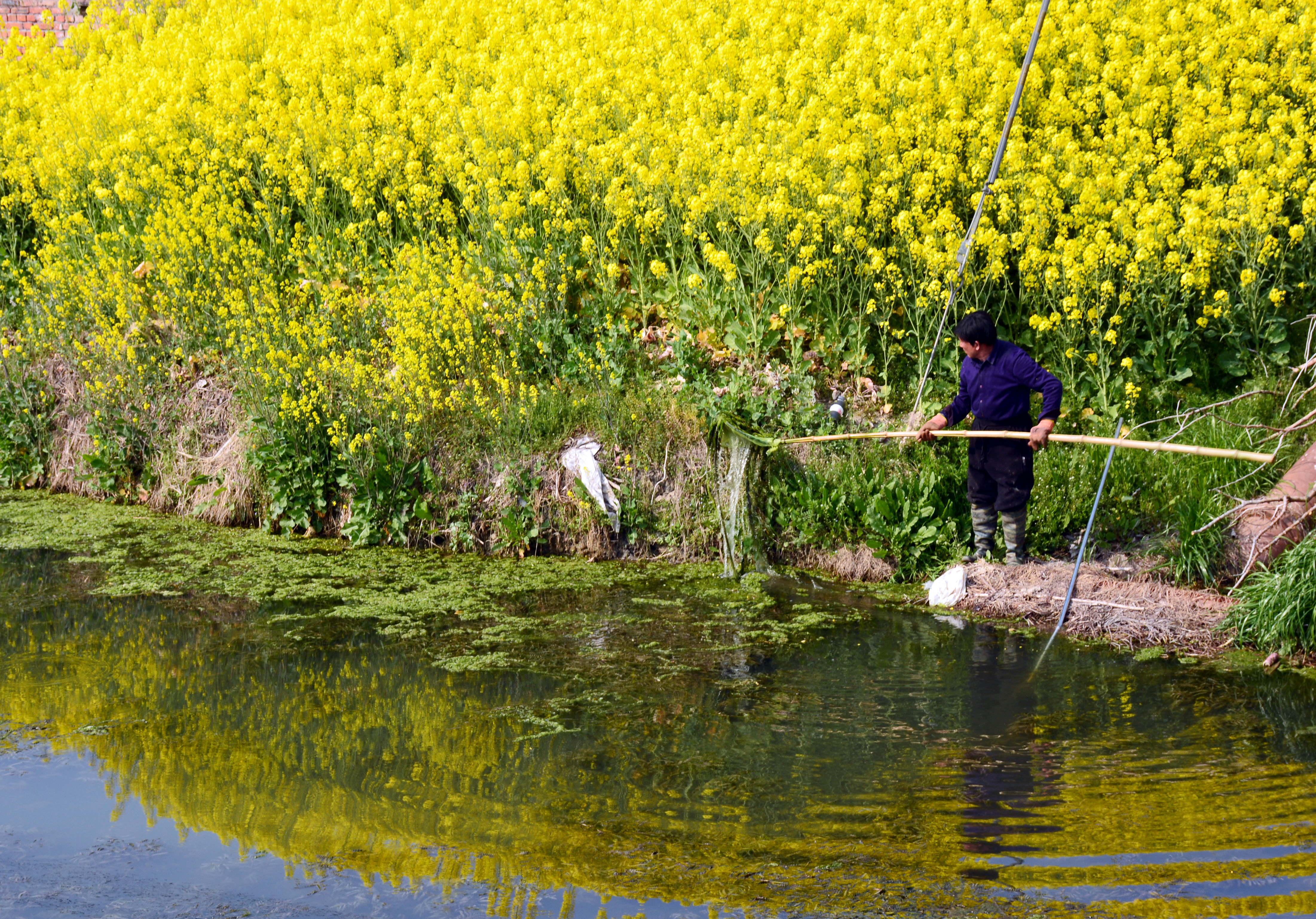 3月29日,在大丰区草堰镇合新村四组,村民陈锦国穿着高筒雨靴,蹚在河道旁,熟练地将水中的水草、漂浮杂物逐一打捞上岸。这是该镇推进农村人居环境整治、“洁”尽全力擦亮乡村生态底色的生动缩影。