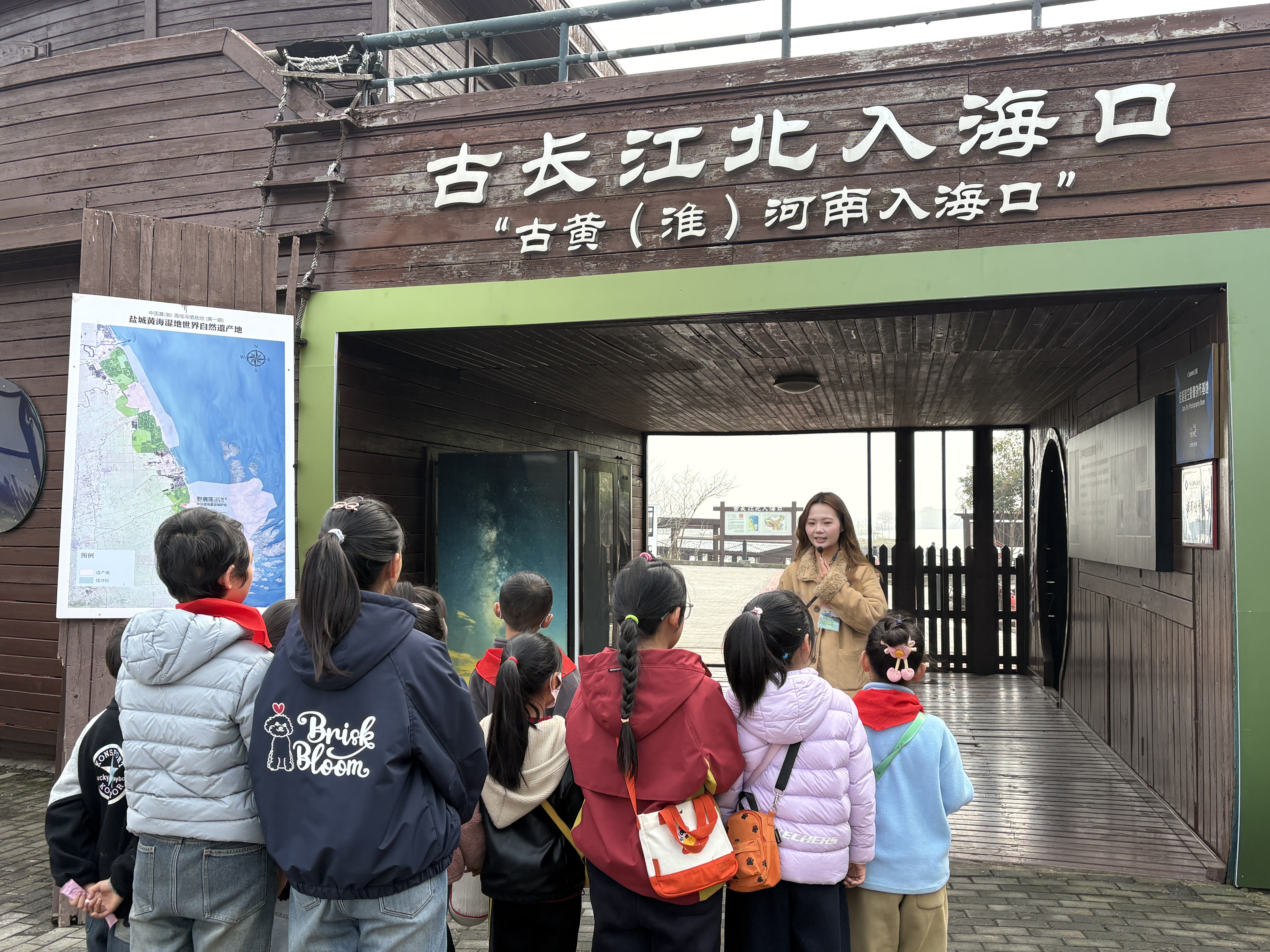 上午9点,参与本次春假研学的青少年及家长齐聚草庙小学门前,有序完成集合签到。志愿者细致讲解活动整体流程与出行安全注意事项后,大家统一乘车前往野鹿荡时空研学基地。在基地内,专业指导老师带领孩子们走进时光科学馆,结合展馆内容生动讲解湿地的历史变迁与生态保护相关知识,通过沉浸式的学习体验,让青少年深入了解自然奥秘,树立敬畏自然、保护自然的意识。随后,大家再次乘车前往黄海野鹿荡自然景区,景区讲解员为孩子们逐一介绍各类动物标本,讲述标本背后的物种知识与生态故事;孩子们乘坐景区观光车穿梭于湿地间,近距离邂逅麋鹿、白鹭等野生动物,亲身感受湿地生态的独特魅力,在春日野趣中观察自然、探索自然,进一步加深了对家乡生态资源的认知与热爱。