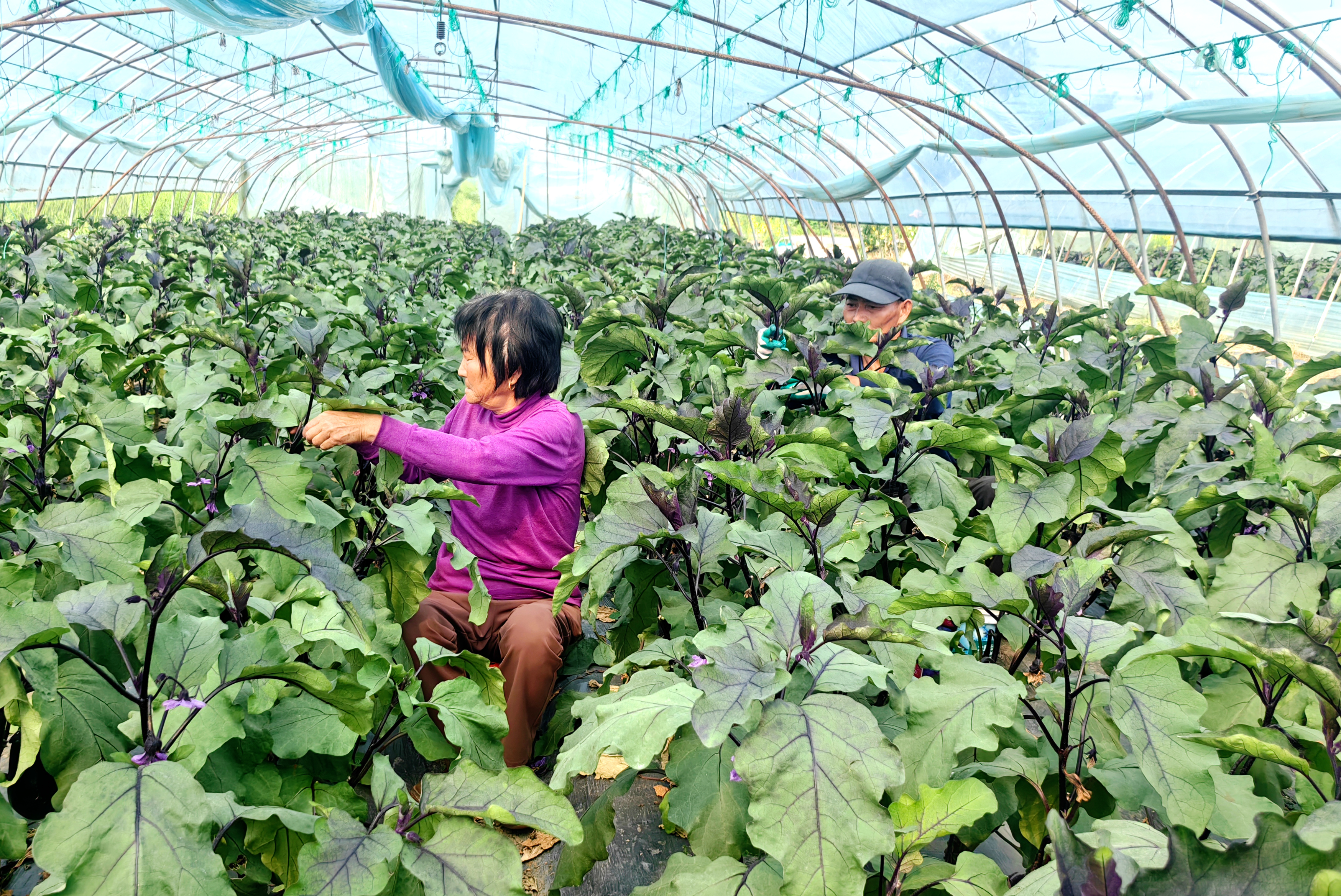4月25日,大丰区草堰镇双河村加祥大棚蔬菜基地内一派繁忙景象,不少低龄老人穿梭在蔬菜大棚间,精心为茄子修剪枝杈、摘除老叶,有效改善植株通风透光条件,助力蔬菜提质增产。