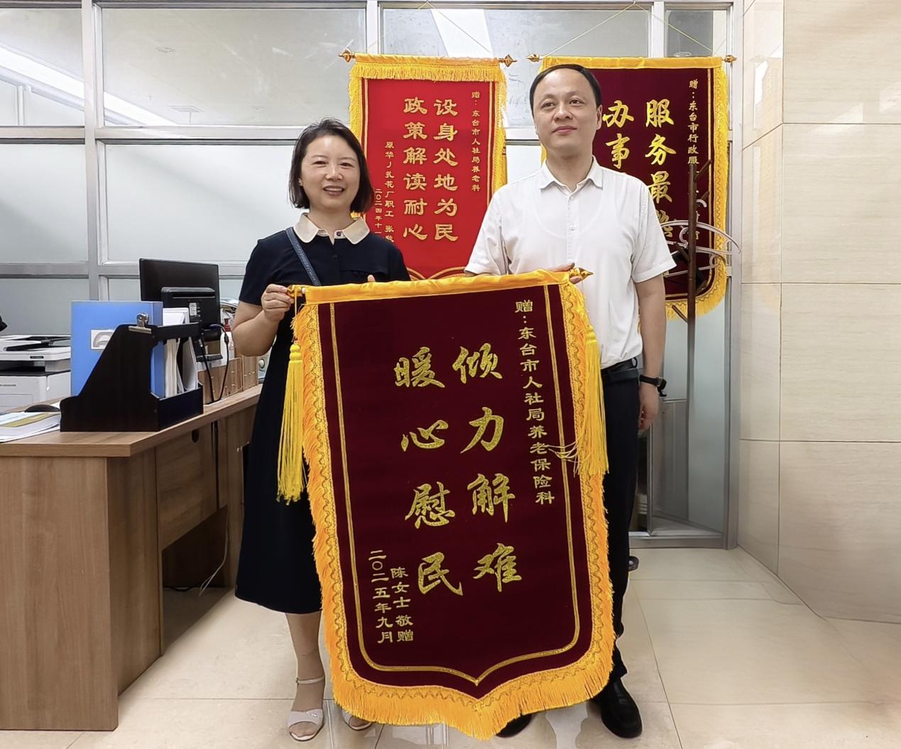 近日,东台市人社局退休办理窗口出现暖心一幕:市民陈女士手持一面写有“倾力解难,暖心慰民”的锦旗,专程送到窗口工作人员手中,对工作人员在其办理退休手续过程中提供的贴心服务和热心帮助表示衷心感谢。