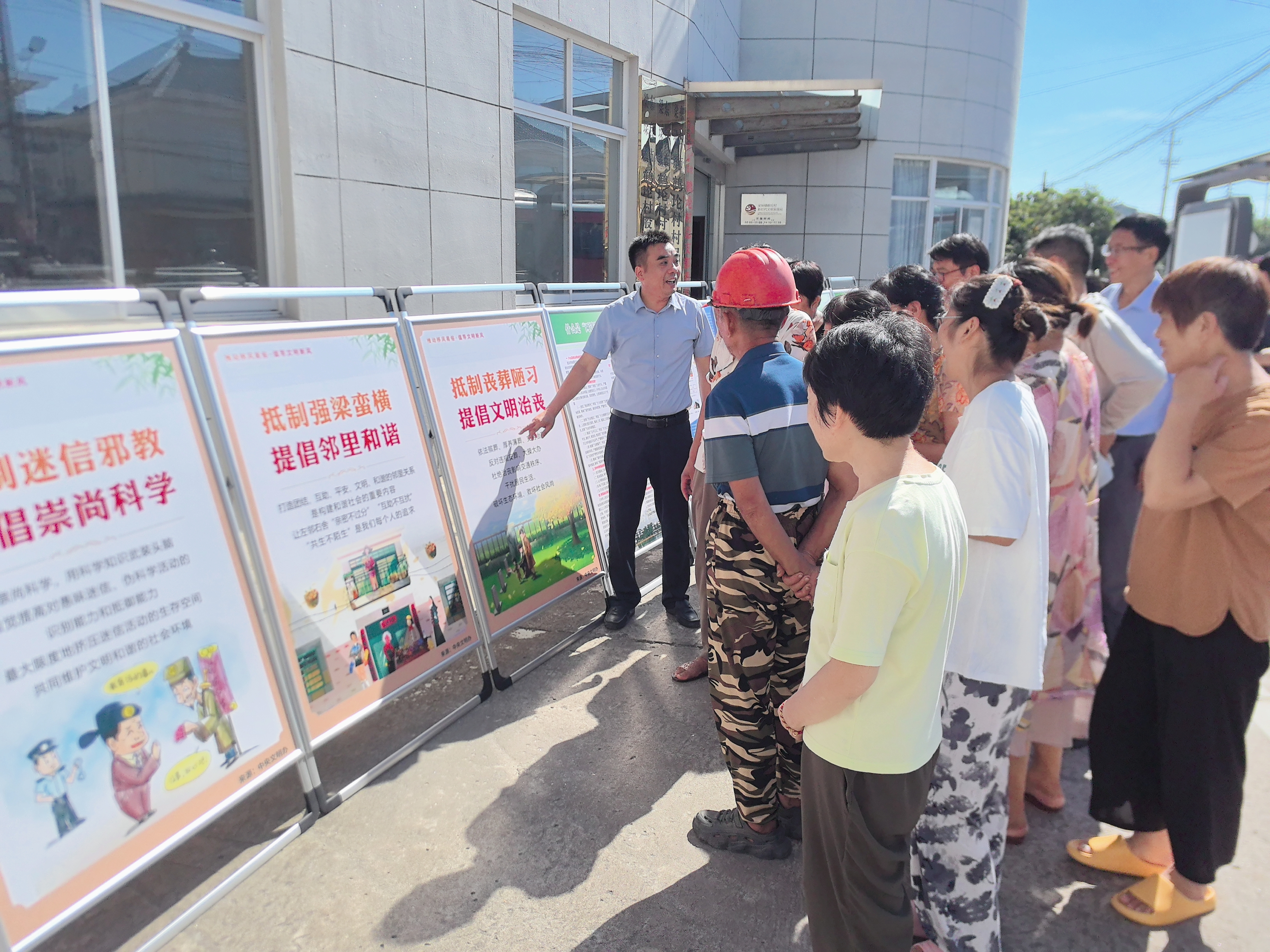 在宣传现场,镇、村志愿者们相互协作,结合本地实际和亲身经历“现身说法”,对展板内容进行解读,对身边典型进行宣传,引导群众破除陈规陋习,反对铺张浪费,远离大操大办、高额彩礼、讲排场搞攀比,做到崇德向善、尊老敬老、厚养薄葬、婚事新办、白事简办、余事不办,争当践行移风易俗、树立新风尚、推进乡风文明的“文明人”。