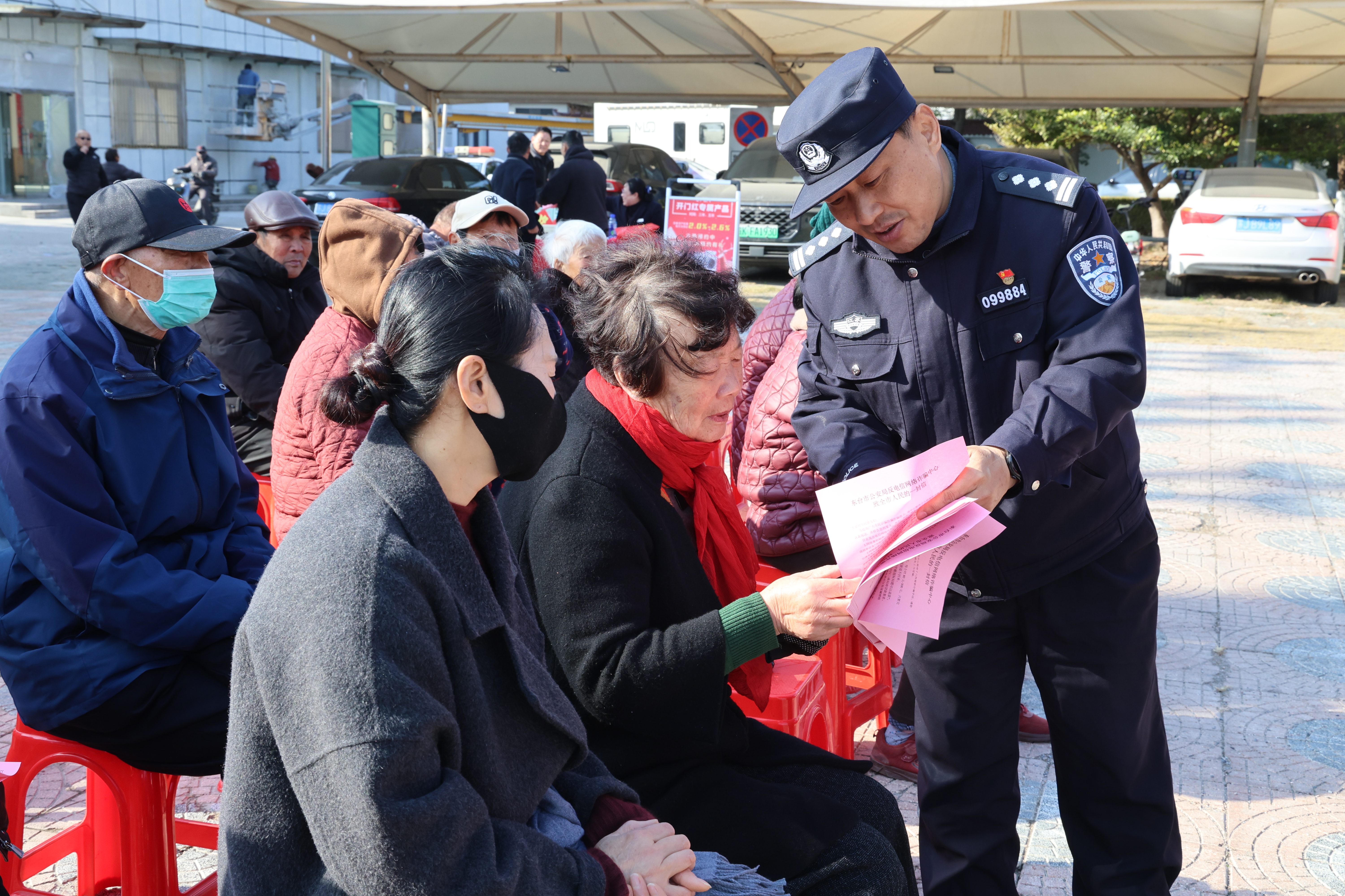台上演员全情投入,台下观众热情回应,掌声与笑声交织,现场气氛温暖而热烈。演出间隙,三仓派出所和三仓邮政局工作人员化身“反诈宣传员”,用通俗易懂语言,结合近期典型诈骗案例,向现场群众讲解账号风险、虚假投资、养老诈骗等常见诈骗手段的识别方法,反复强调“警惕账号风险,诈骗莫上当”的安全理念,将金融反诈知识送到群众身边。