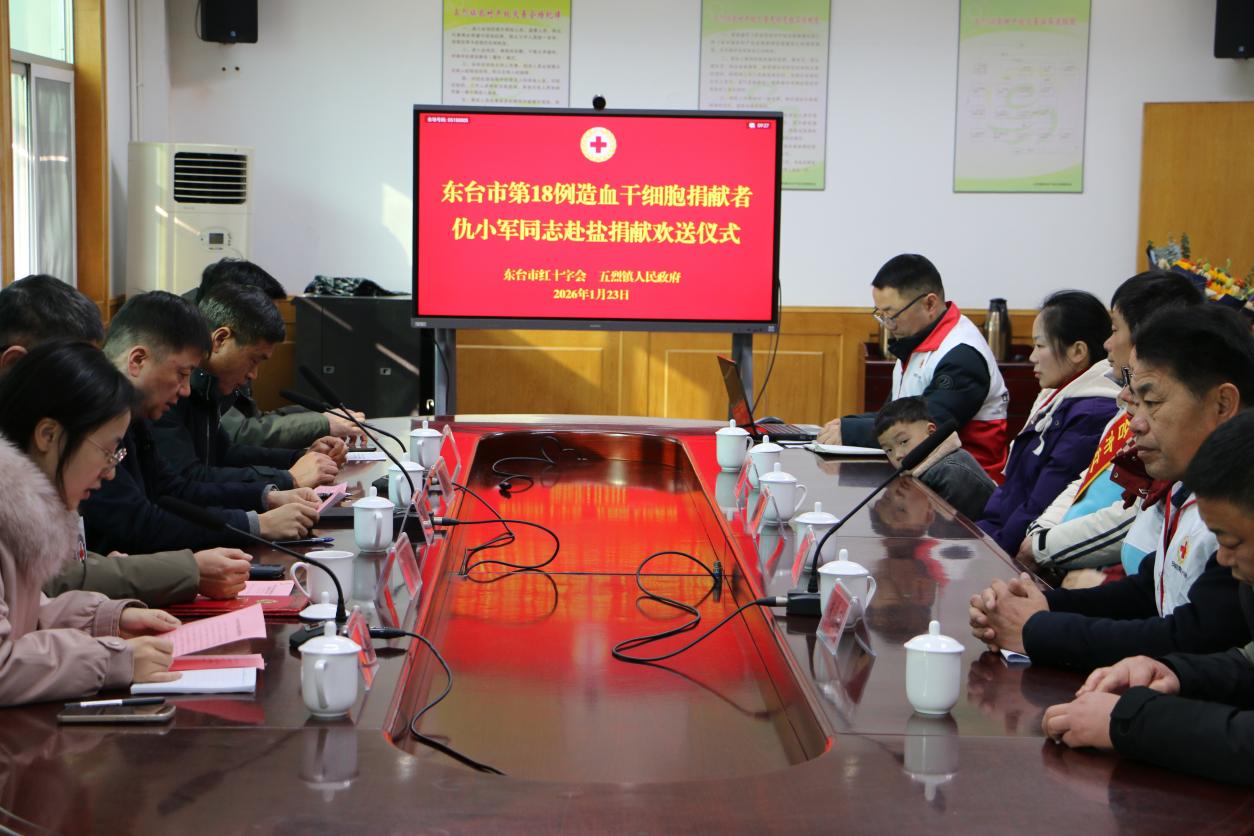东台市红十字会秘书长何斌致辞中,对仇小军的捐献善举给予高度评价与充分肯定。他表示,捐献造血干细胞是一项光荣而神圣的事业,仇小军同志接过这根沉甸甸的“爱心接力棒”,即将成为东台市2026年首例、全市第18例造血干细胞捐献者,同时也是五烈镇继首例涉外捐献者、五烈镇甘港村青年党员唐宇之后的第2例造血干细胞捐献者。这一里程碑式的善举,不仅为东台市新一年造血干细胞捐献工作拉开爱心序幕,更标志着全市人道公益事业迈上新的台阶!