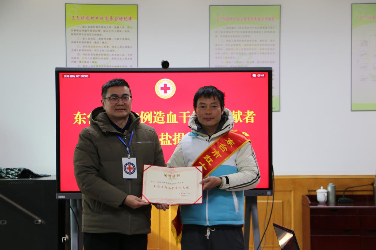 东台市红十字会秘书长何斌授予仇小军同志“东台市红十字爱心大使”证书。