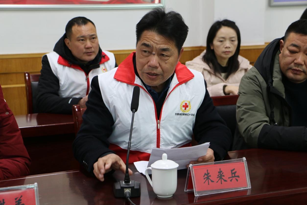 五烈镇红十字志愿者代表、甘港村副主任、村红十字会副会长朱来兵详细介绍了东台市首例涉外造血干细胞捐献者唐宇的先进事迹及近年来本村红十字会的基层组织建设情况。