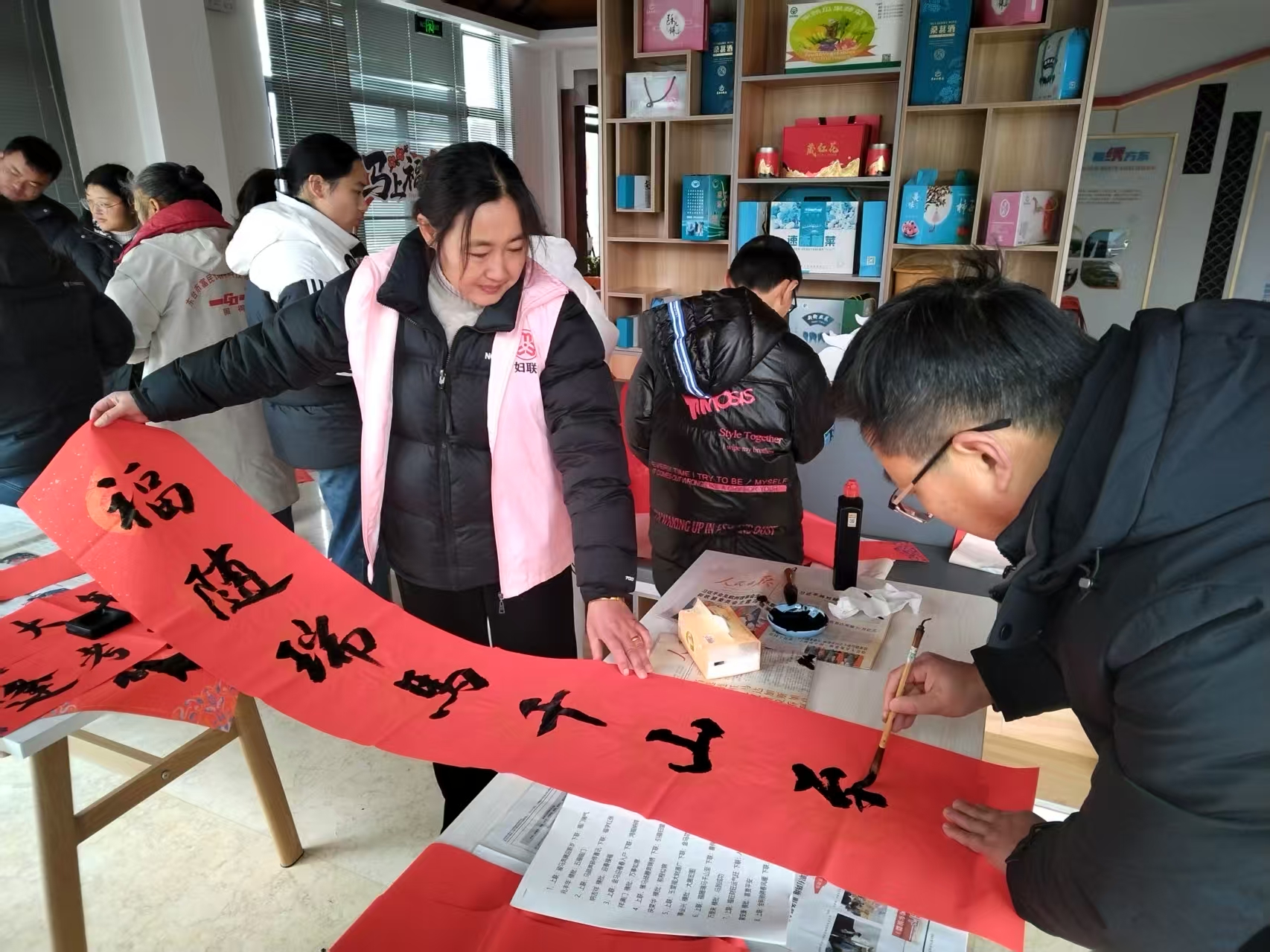 活动现场暖意融融、喜庆祥和,处处洋溢着欢乐温馨的节日氛围。红纸铺案,墨香袅袅,书法爱好者与志愿者凝神运笔、挥洒自如,笔锋或行云流水、或清新飘逸、或苍劲有力。一副副对仗工整、意蕴吉祥的春联,一个个饱满喜庆的“福”字,引得现场村民驻足观赏、连声赞叹。