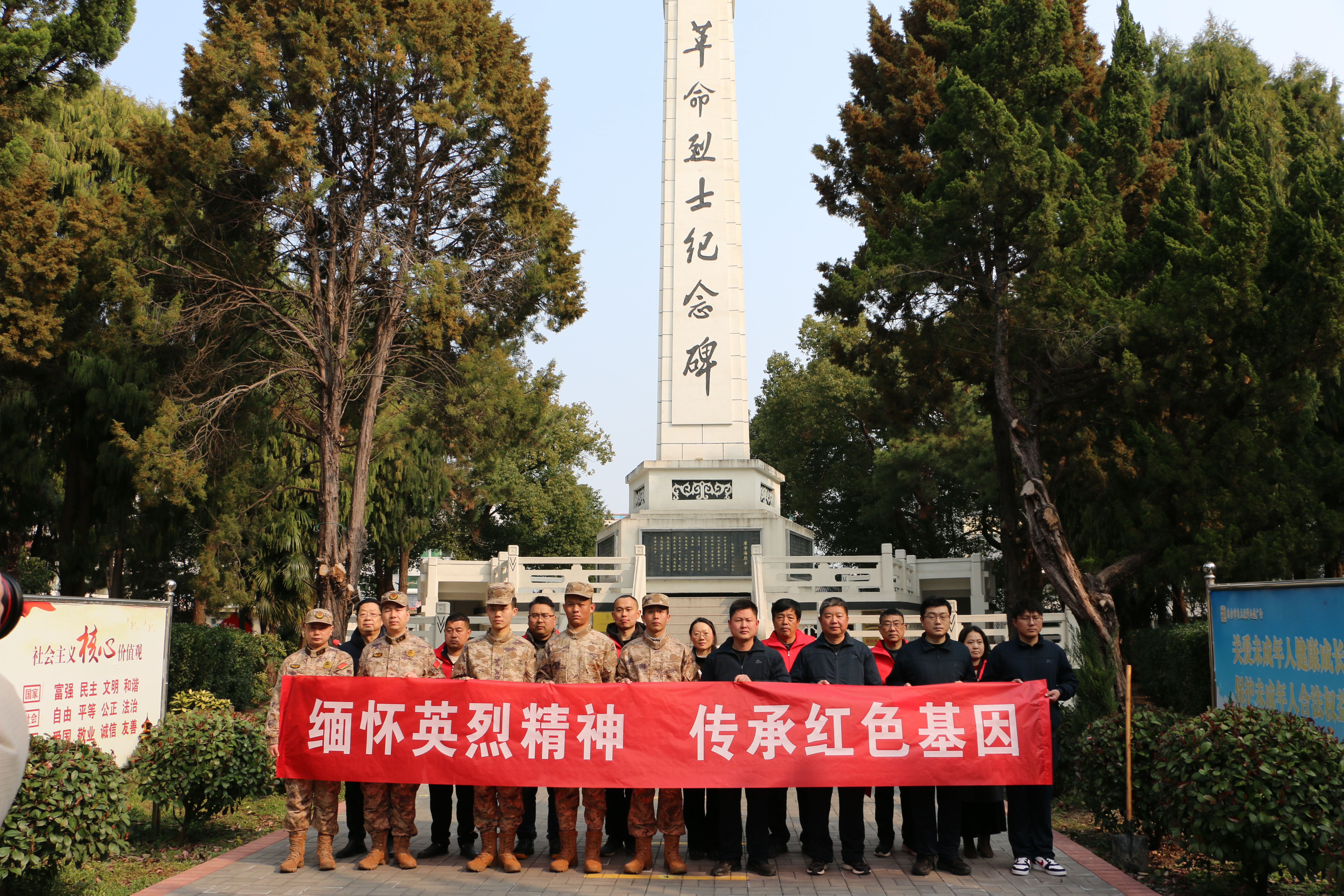 阳光下,鲜红的横幅、翠绿的松柏、肃穆的丰碑交相辉映,定格成一幅赓续传承的生动画面。