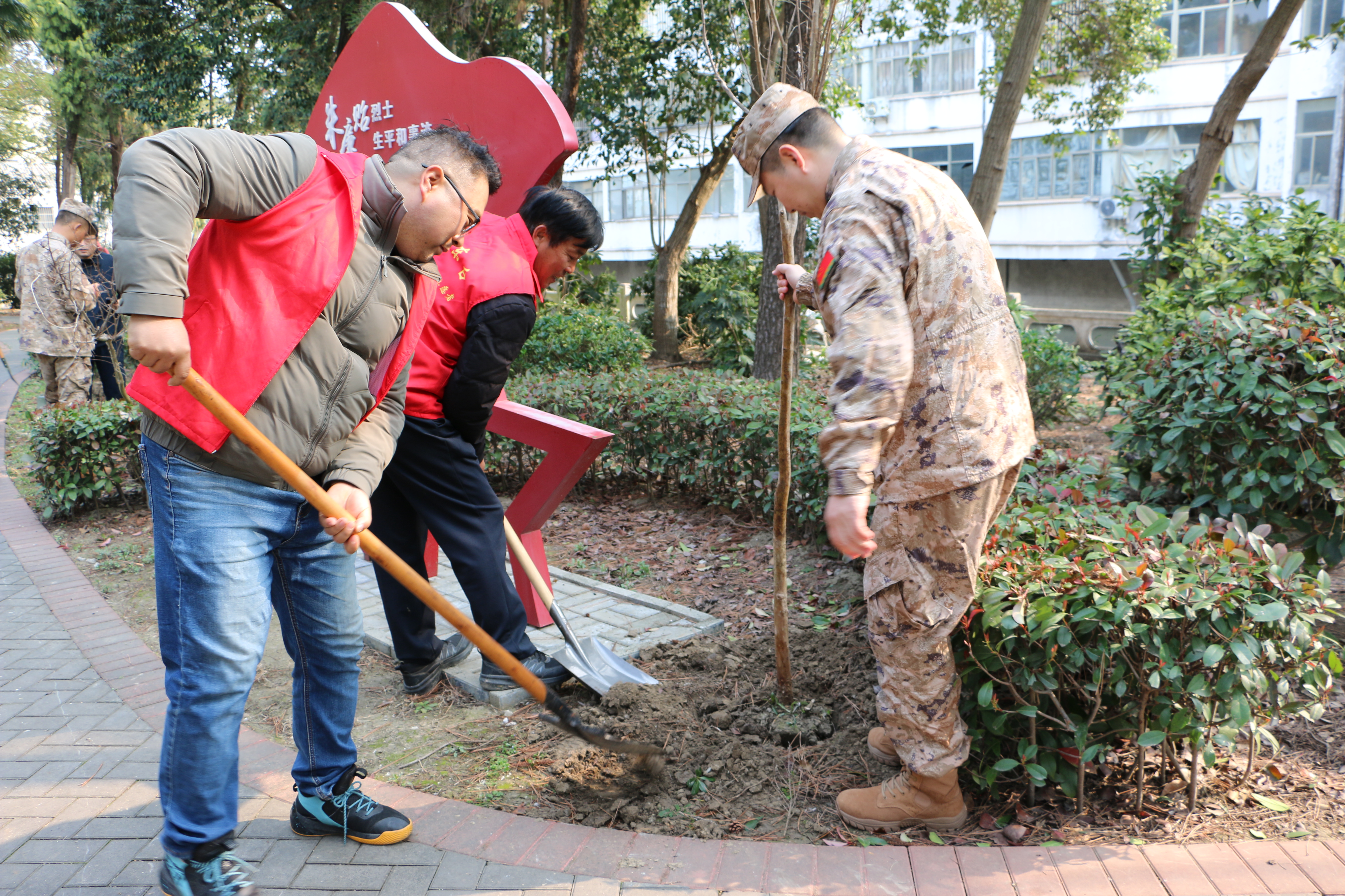 上午9时40分,义务植树环节正式展开。在划定区域内,大家三人一组、五人一队,挥锹挖坑、扶苗培土、提水浇灌,分工协作,井然有序。经过紧张劳动,一株株苗木在陵园空地“安家落户”。松柏常青,象征着英烈精神万古长存;红枫似火,寓意着红色基因代代相传。