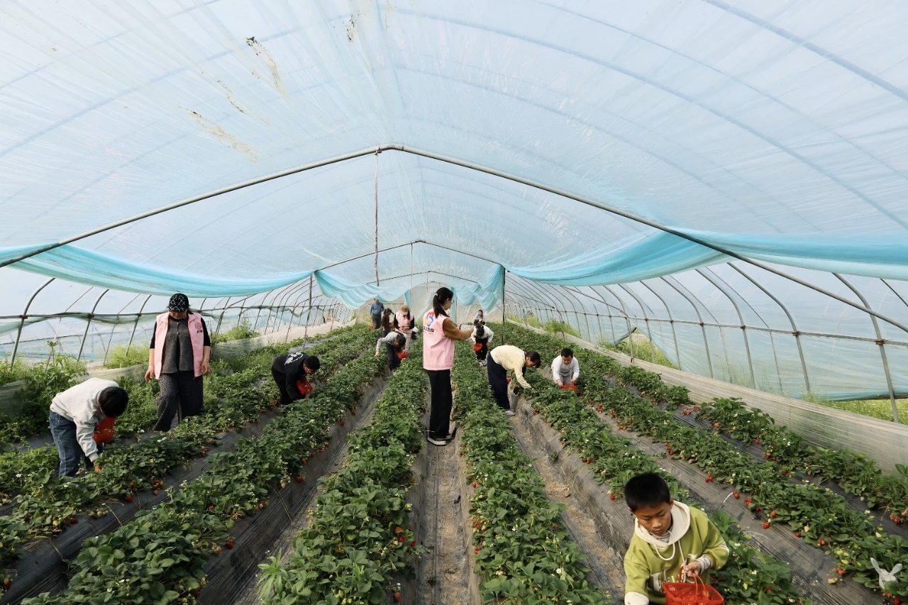 室内书香未尽,户外春光已浓,孩子们还乘坐观光车开启了亲近大自然寻春之旅。大家依次走进三村沿线的露营基地、油菜田、花卉基地和草莓采摘园,体验户外游乐、油菜花拾趣塑封、植物科普和鲜果采摘。本土自然与文旅资源被充分盘活,孩子们在沉浸式体验中感受乡野乐趣,放飞了心情。