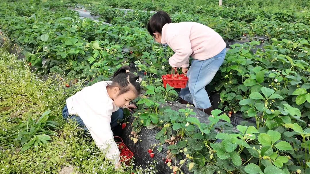 在草莓采摘园,孩子们提着篮子穿梭在田垄之间,亲手摘下红艳果实,体验收获的喜悦与劳动的甘甜。
