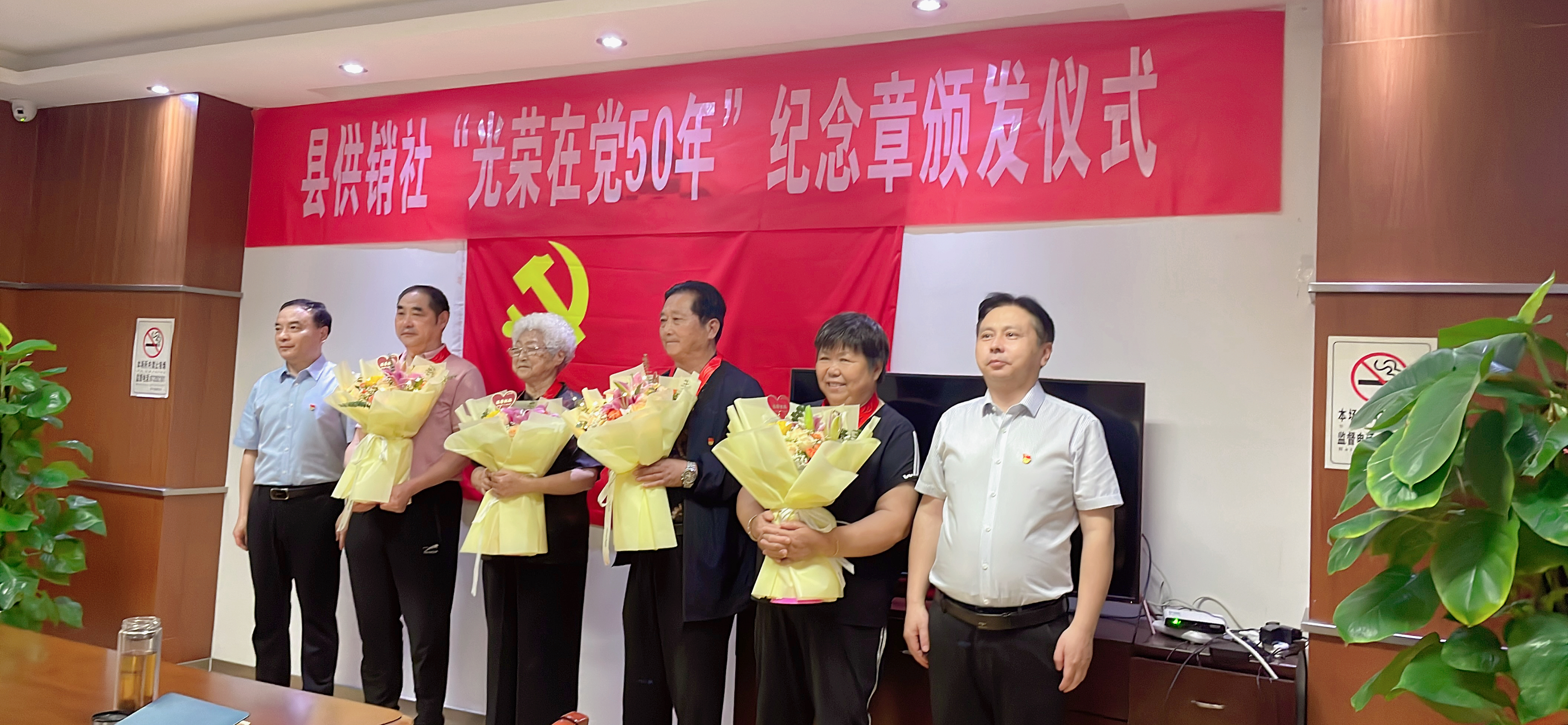 6月20日,阜宁县供销总社举行主题党日活动,为全县供销系统“光荣在党50年”的8名老党员颁发纪念章,并敬献鲜花。