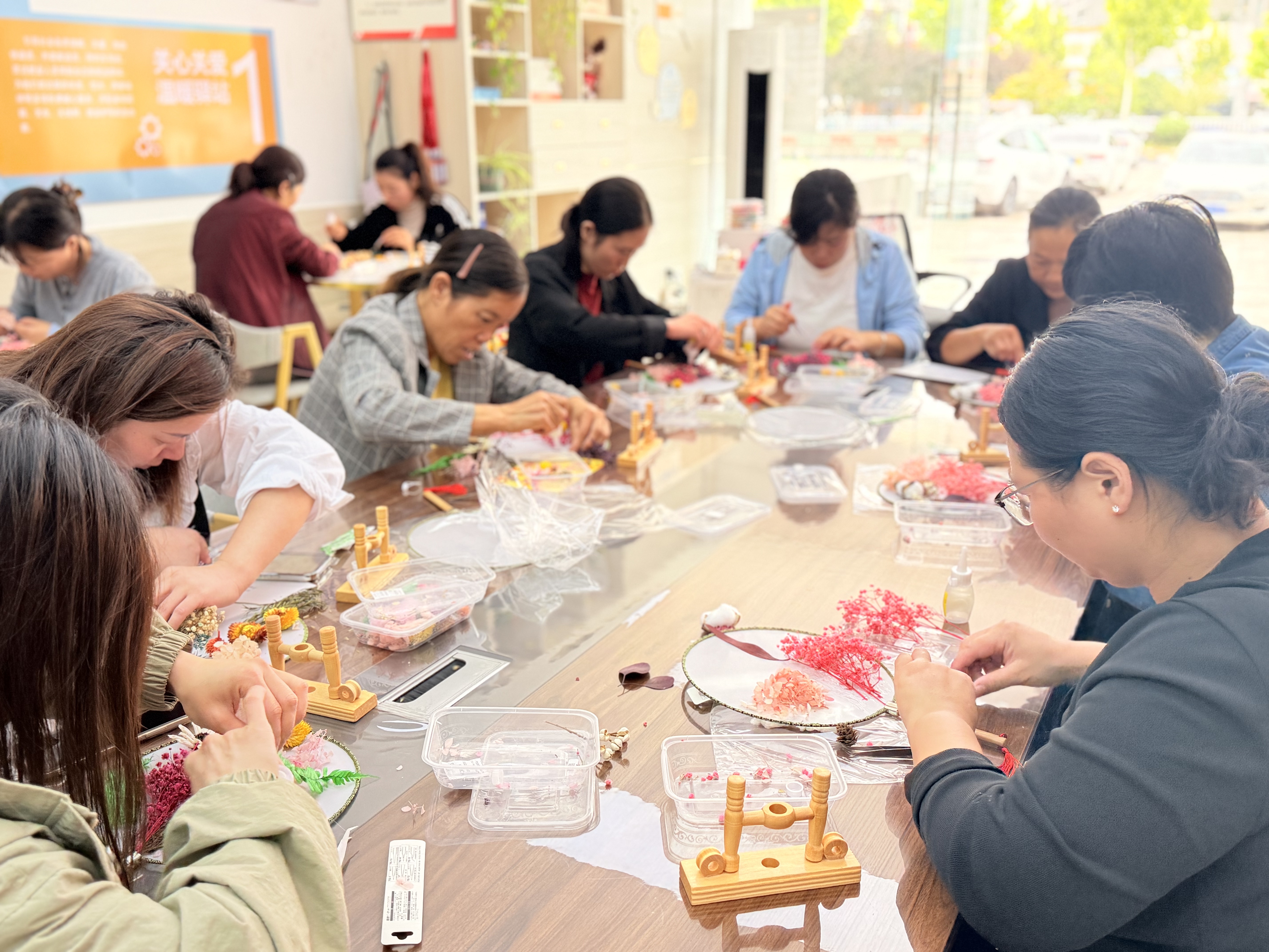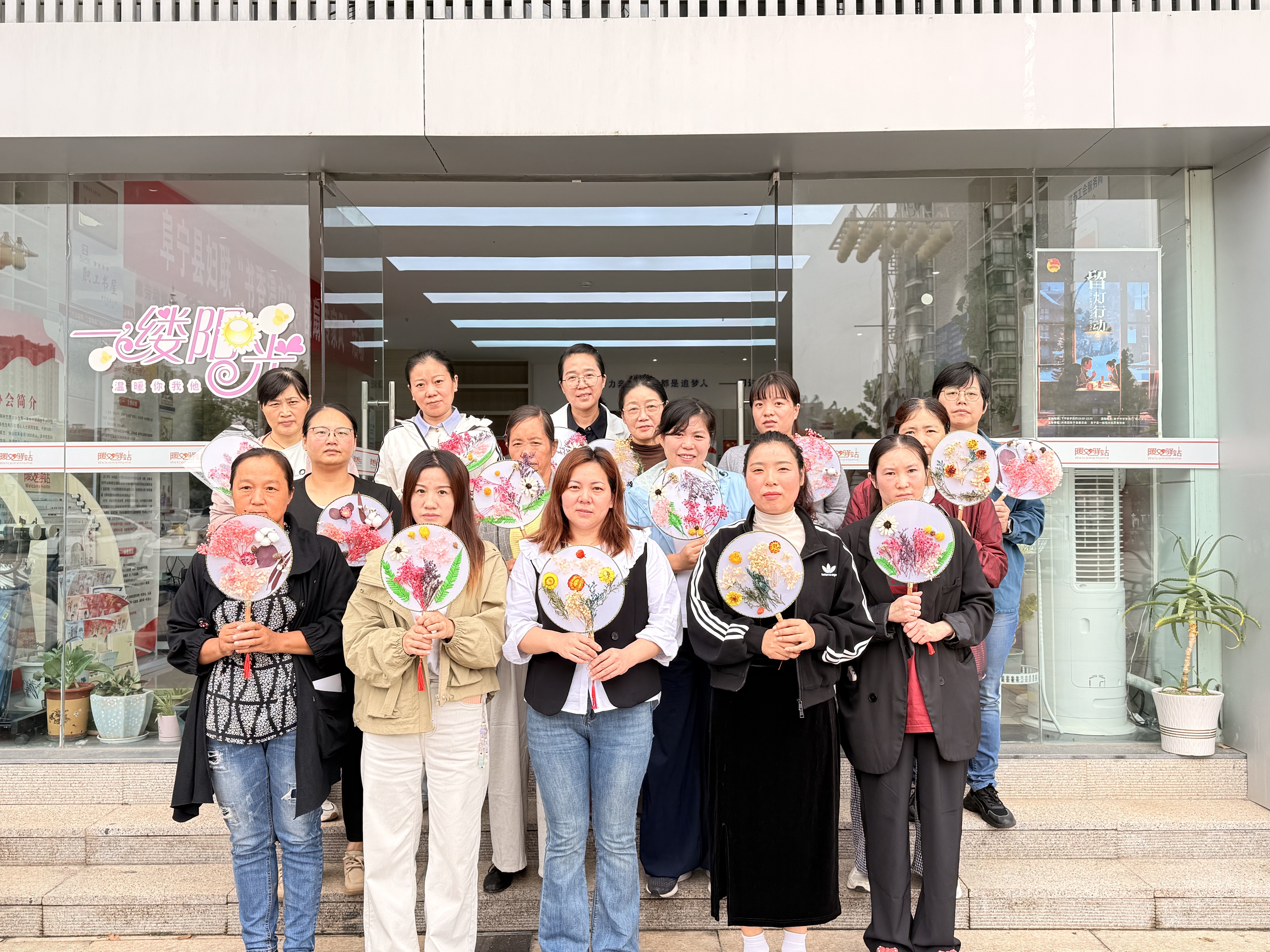随后的团扇手作环节氛围愈发热烈。巾帼志愿者提前将剪裁整齐的干花、环保胶水、素面团扇等材料分发至每位妈妈手中。大家围坐成圈,有的专注摆置花材构图,有的细心调整色彩搭配,有的耐心粘贴固定,指尖流转间,原本空白的团扇逐渐绽放出独特美感——或清雅简约,或灵动鲜活,每一件作品都承载着妈妈们的巧思与心意。现场欢声笑语不断,温馨的节日氛围在彼此的交流中愈发浓厚。