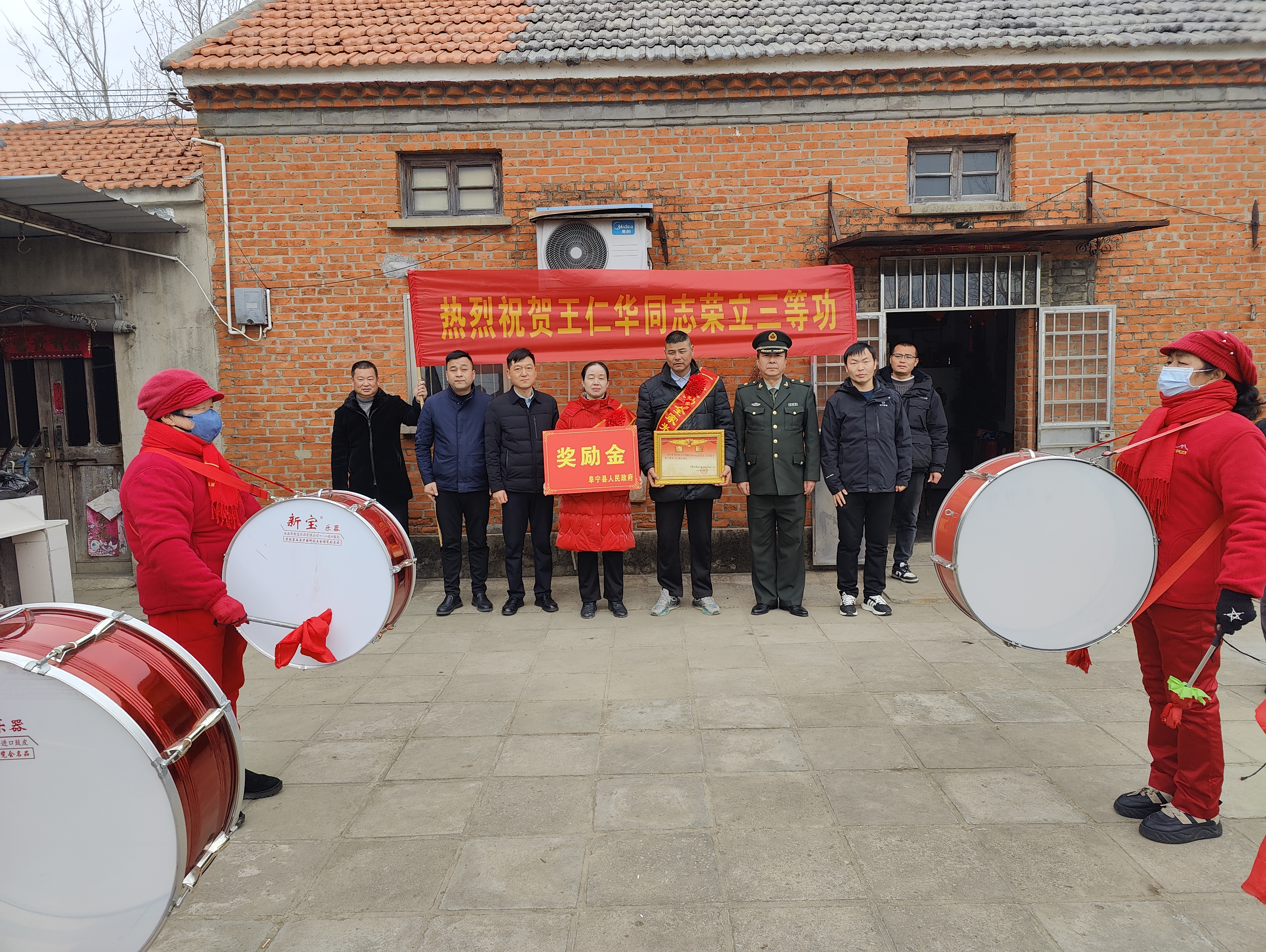 新春佳节,捷报频传。2月10日,阜宁县人武部、县退役军人事务局联合陈良镇人武部、退役军人服务站组成慰问组,专程来到陈良居现役军人王仁华家中,举行庄重热烈的送喜报仪式,为其家属送上三等功喜报、奖励金及新春祝福。