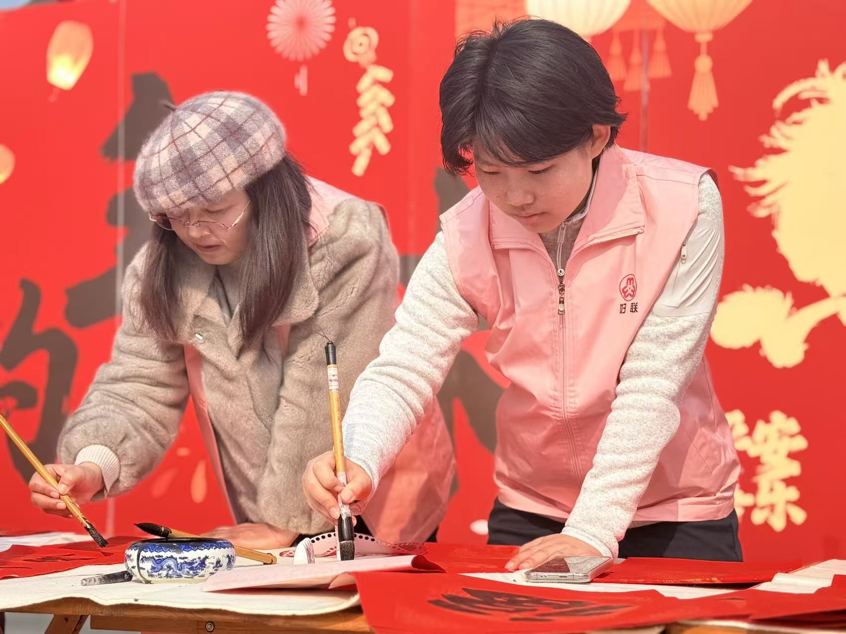 活动现场设置书法、剪纸两大互动展位,氛围热烈又温馨。书法展位前,巾帼志愿者凝神执笔、挥毫泼墨,一笔一画尽显笔墨底蕴,一幅幅春联对仗工整、一个个福字饱满喜庆,满载着新春的美好祝愿。剪纸展位上,志愿者巧手翻飞,折叠、裁剪、雕琢一气呵成,纸屑落下间,一副副灵动精巧的窗花与吉祥纹样次第呈现,年味十足。