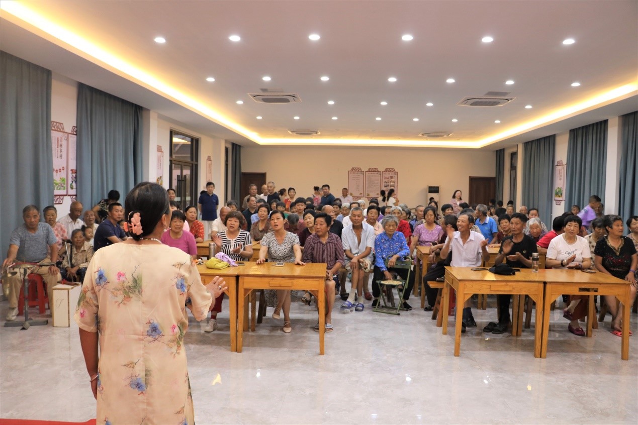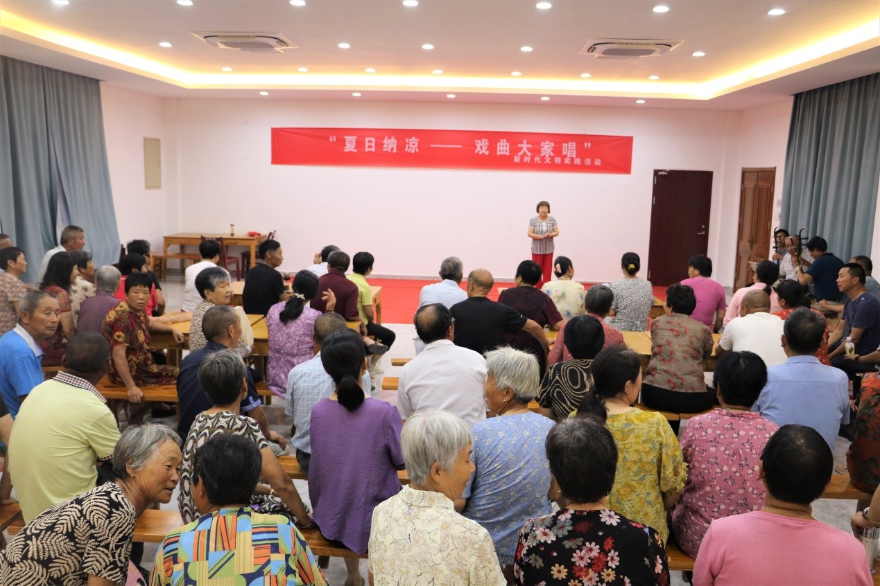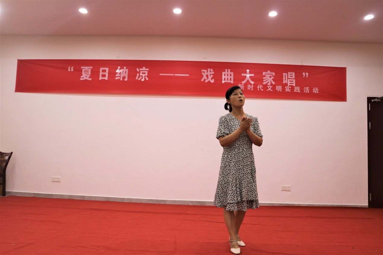 白天烈日炎炎,晚上微风习习。8月1日晚,建湖县高作镇光明人家农村新型社区农民大食堂内座无虚席,由高作镇新时代文明实践所主办的“夏日纳凉—戏曲大家唱”活动吸引了社区和周边众多民居,大家踊跃登台献艺,淮剧唱段《手捧鸡头花香藕》《阵阵秋风折残荷》和歌曲《打靶归来》《红梅赞》等经典戏曲、歌曲赢得台下阵阵掌声。整个活动中,大食堂里充满欢声笑语,其乐融融。