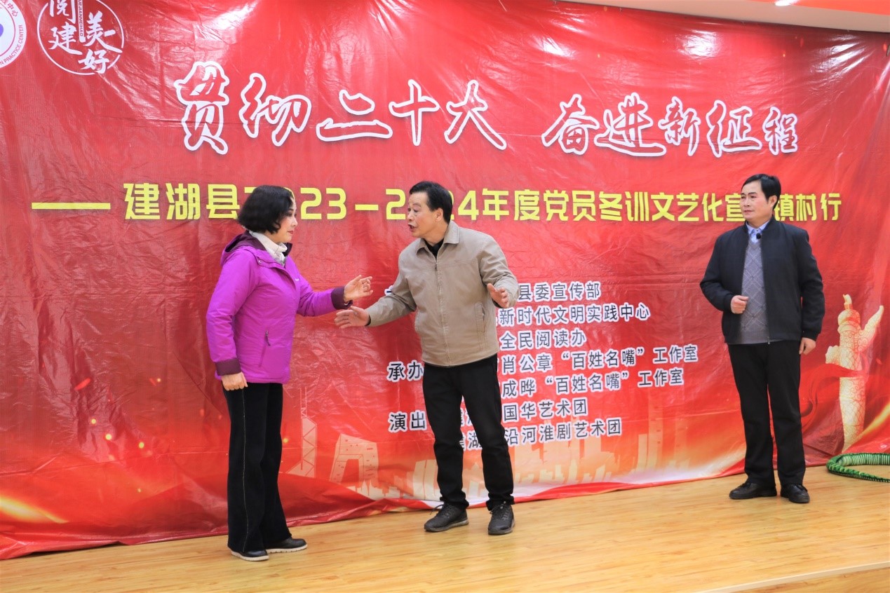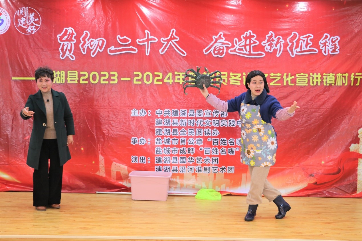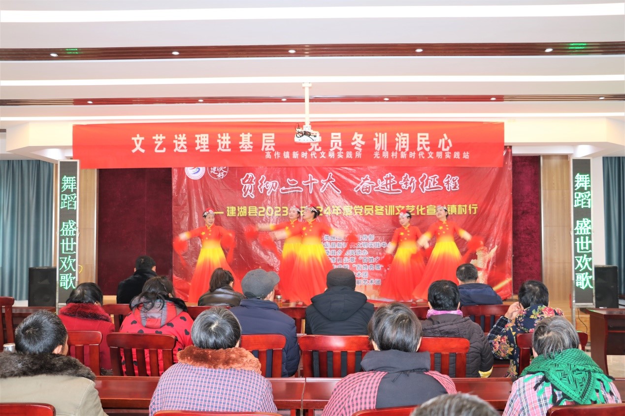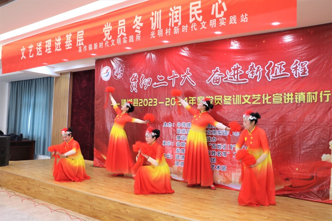 2月24日,由建湖县委宣传部、建湖县新时代文明实践中心、建湖县全民阅读办主办的建湖县2023—2024年度党员冬训文艺化宣讲镇村行活动走进高作镇光明村。舞蹈《盛世欢歌》,舞动绚丽岁月,歌唱精彩生活,赢得来自机关、社区党员群众的热烈掌声;小品《选标兵》,宣传典型,积极倡导全民阅读--日读1小时、书香我参与;小淮剧《水乡“新农人”》,讲述了新时代新农人在大有作为的新农村的奋斗历程,他们积极干事创业、努力打拼,不仅实现了自我价值,也成为了乡村振兴的主力军。