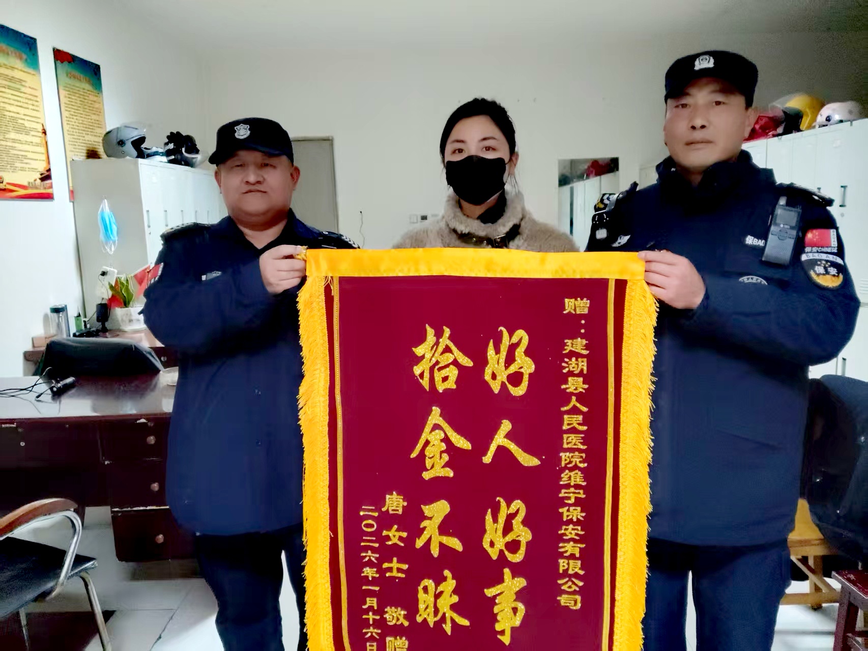 1月20日上午,在建湖县人民医院安保部,市民唐女士专程送来一面绣着“好人好事、拾金不昧”的锦旗,言语间满是激动与感激。这暖心一幕的背后,是维宁保安公司员工一场彰显责任与担当的“寻物接力”。