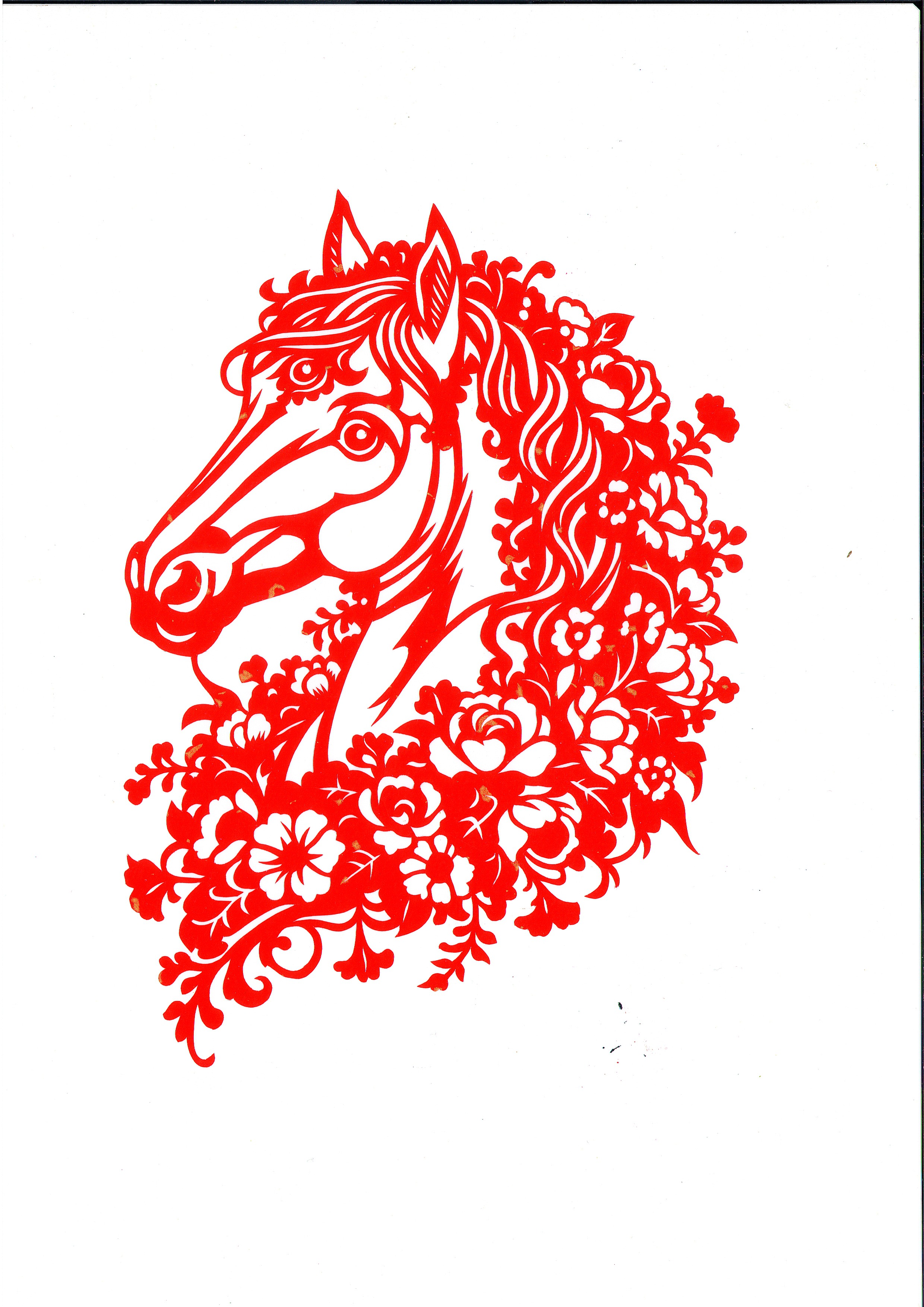 而“吉祥如意”则将马头与繁花结合,马的眼神温润有神,周围牡丹、莲花、梅花四时花卉同框,寓意四季平安、富贵吉祥。这幅作品采用了冈西剪纸特有的“阴阳刻”结合技法,实与虚、红与白之间,营造出丰富的层次感。