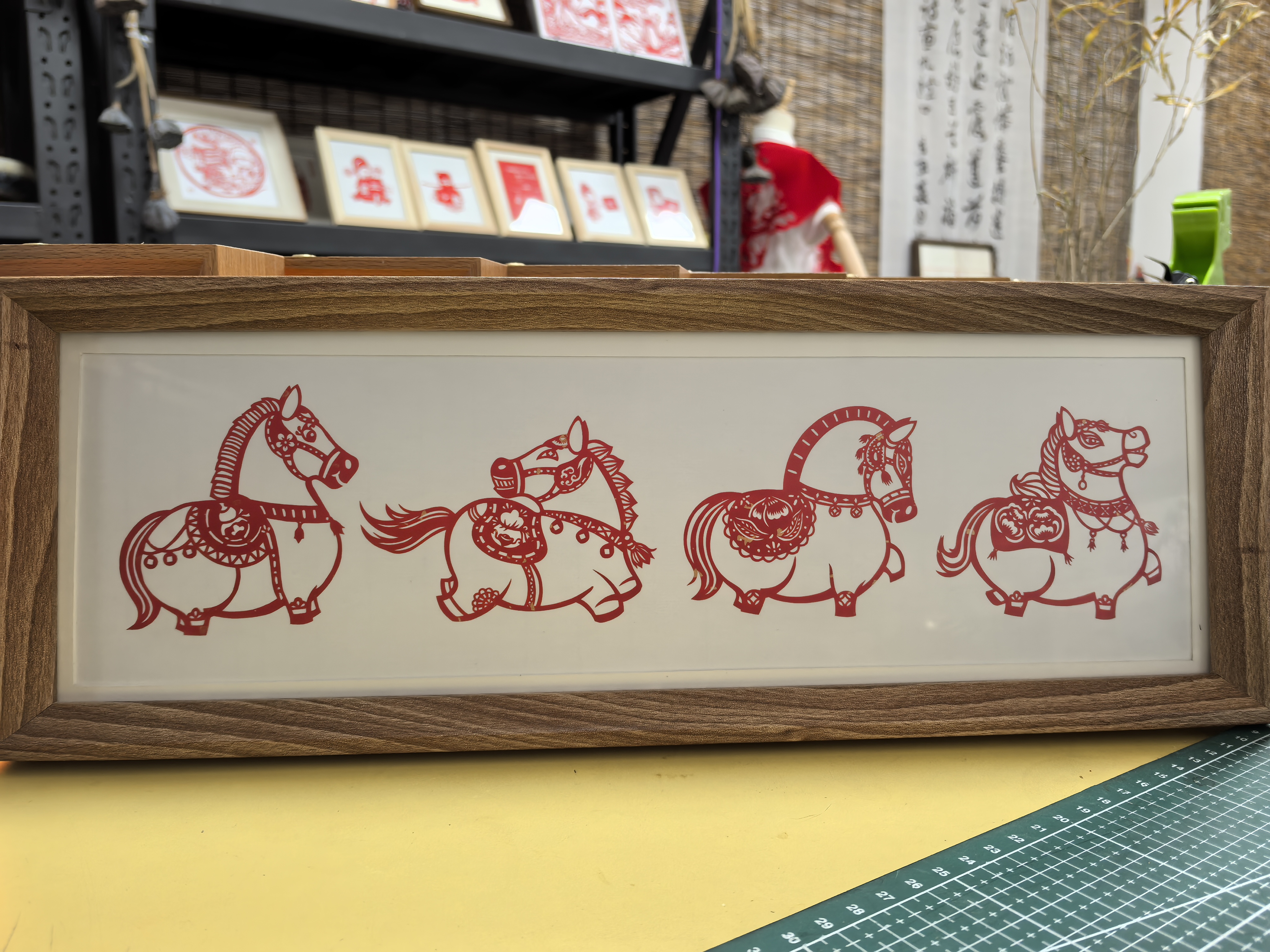 妻子施君君则精于细节与传承。她的剪刀下,花瓣的层叠、叶脉的纹理、马眼的灵动皆栩栩如生。“施老师的作品最见功夫,”唐进文常对来访者如此介绍,“每一刀都要心中有数,多一分则碎,少一分则僵。”那些装裱在木质框架中、图案繁复精致的生肖与花卉剪纸,大多出自她手。