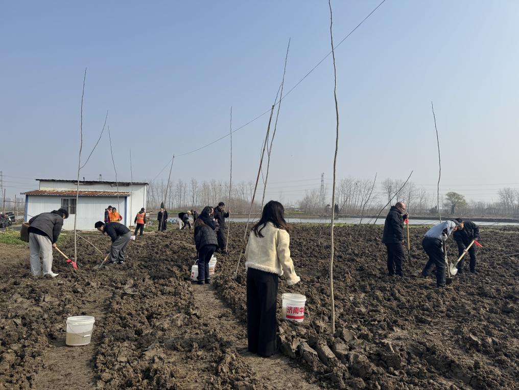 活动现场,青年们分工协作、默契配合,扶苗、填土、踩实、浇水,一气呵成。这群平日里与算法、代码和无人机为伴的未来产业新青年,此刻化身绿色使者,拿起铁锹、水桶,热情高涨地投入到植树劳动中。经过一个多小时的辛勤劳作,一片“智林”在春风中昂然挺立。