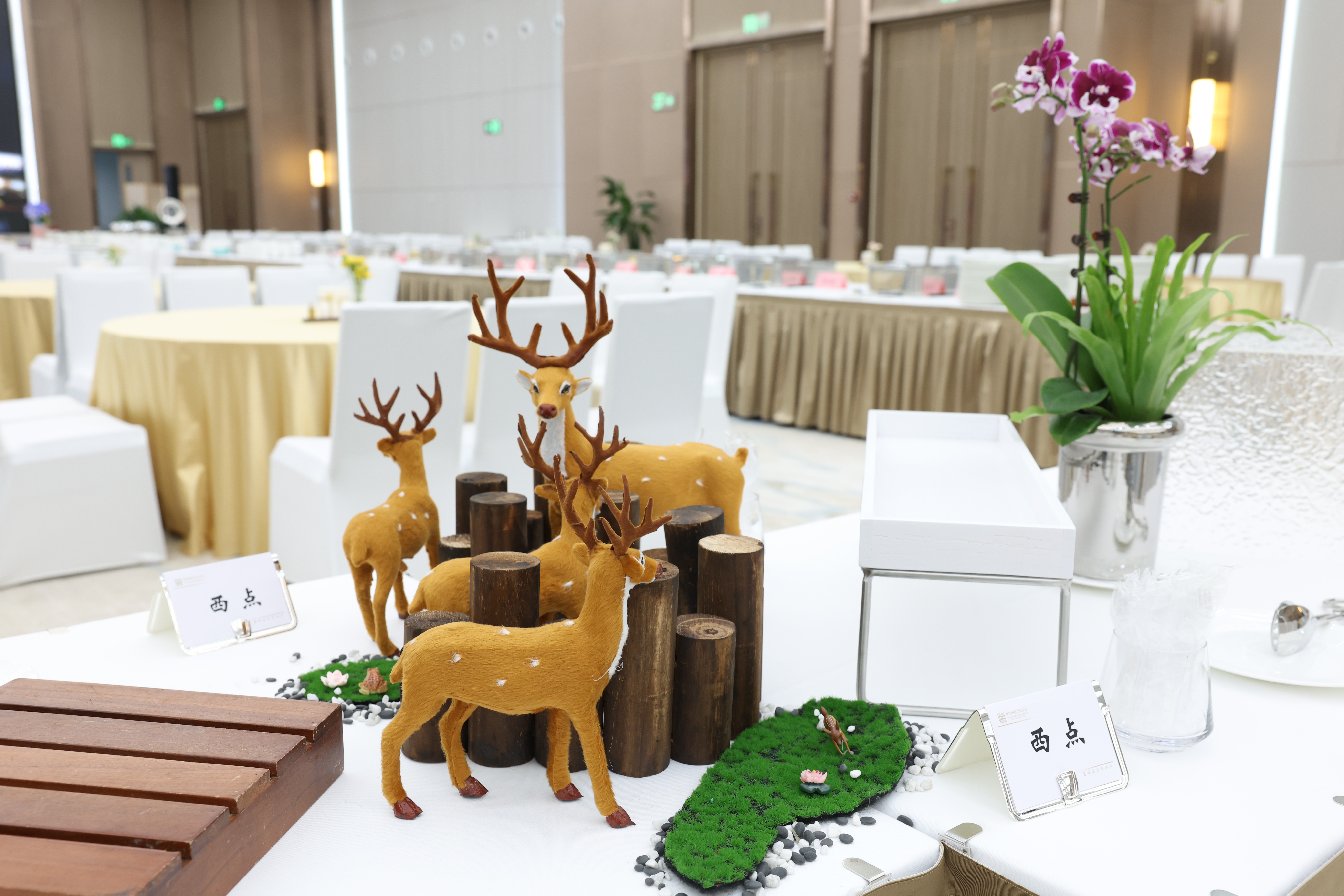除了味觉上的惊喜,国展会议中心在餐饮摆台设计上也别具巧思。设计团队将麋鹿、丹顶鹤、勺嘴鹬等黄海湿地特有的动物形象,以卡通造型的形式融入摆台之中,再搭配蝴蝶兰与小假山等元素,憨态可掬的动物造型与雅致的自然景观相映成趣,为用餐环境增添了一抹灵动韵味,让中外嘉宾在美食中感受城市的温度与魅力。
