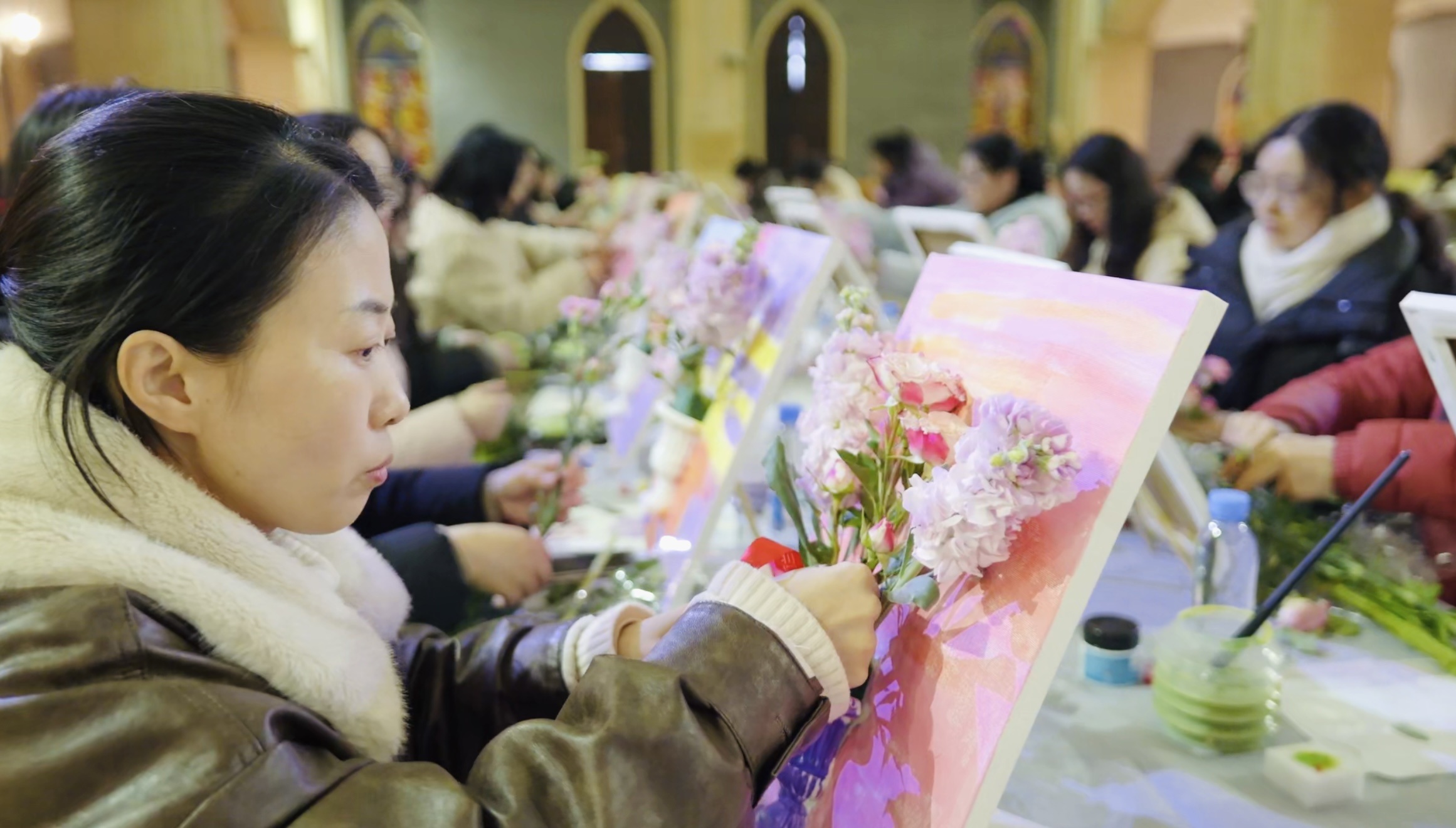 为提升女性同胞知美、爱美、会美的生活情趣,大家来到花海旁的体验区,围绕“花漾巾帼”主题,尝试油画创作与花艺搭配。在老师的悉心指导下,大家发挥创意,调色、构图、插花、修剪……平日里忙碌于工作一线的她们,此刻静下心来,专注于笔尖与指尖的流转。一幅幅色彩明快的油画,一束束别致清新的花艺作品悄然诞生,每个人脸上都洋溢着满足与喜悦。“不仅学到了绘画和花艺知识,还收获了一份专属自己的礼物,真是既惊喜又温暖!”
