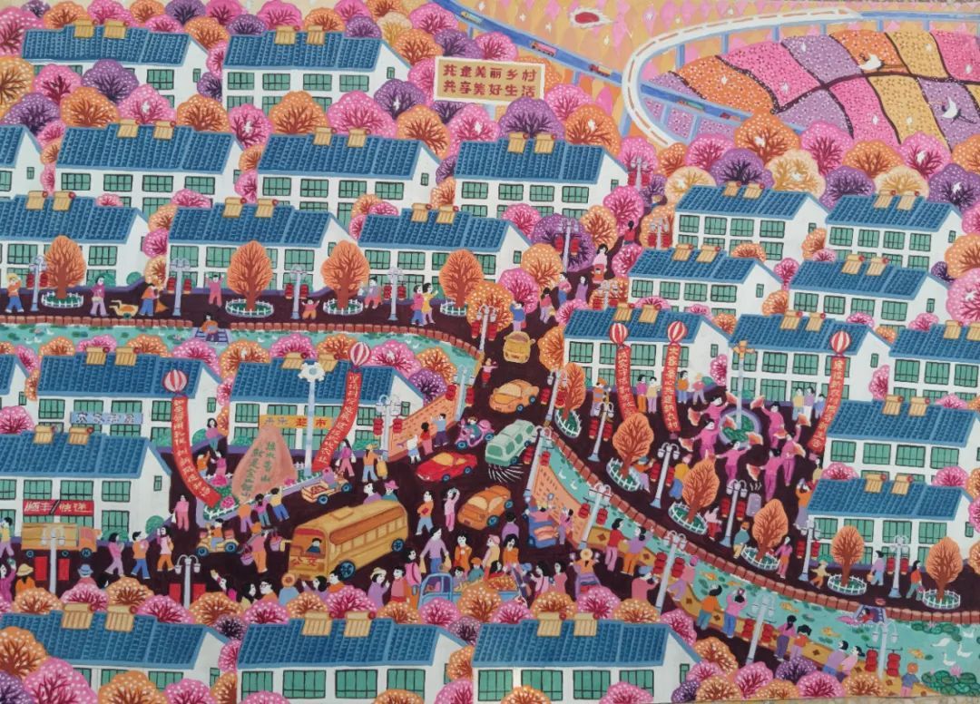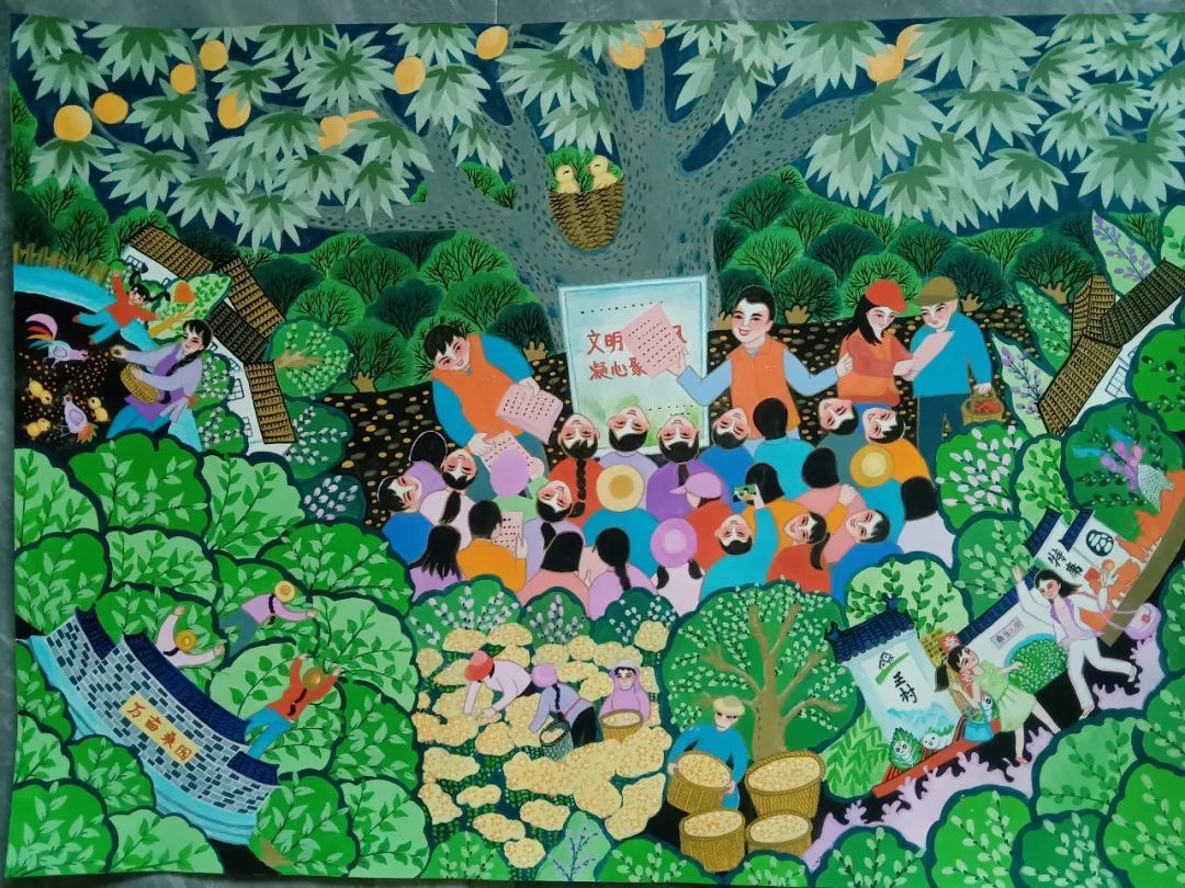 射阳农民画是从现代民间艺术基础上发展起来,一些农民在耕作之余,自发地利用墙壁、黑板,开始创作壁画、漫画,来反映现实生活中的新人新事。五谷丰登、百花盛开、蟹肥菊黄、丹鹤归来、绿树成荫……这群“白天拿锄头,晚上拿笔头”的“农民画画家”们创作了一批批画作,反映改革开放以来,鹤乡各个村(居)发展变迁的点点滴滴,用手中彩笔描绘出一幅幅现代乡村的幸福画卷。农民画(射阳农民画)入选江苏省省级第四批非物质文化遗产代表性项目名录传统美术类项目。(图片来源:射阳县文化馆)