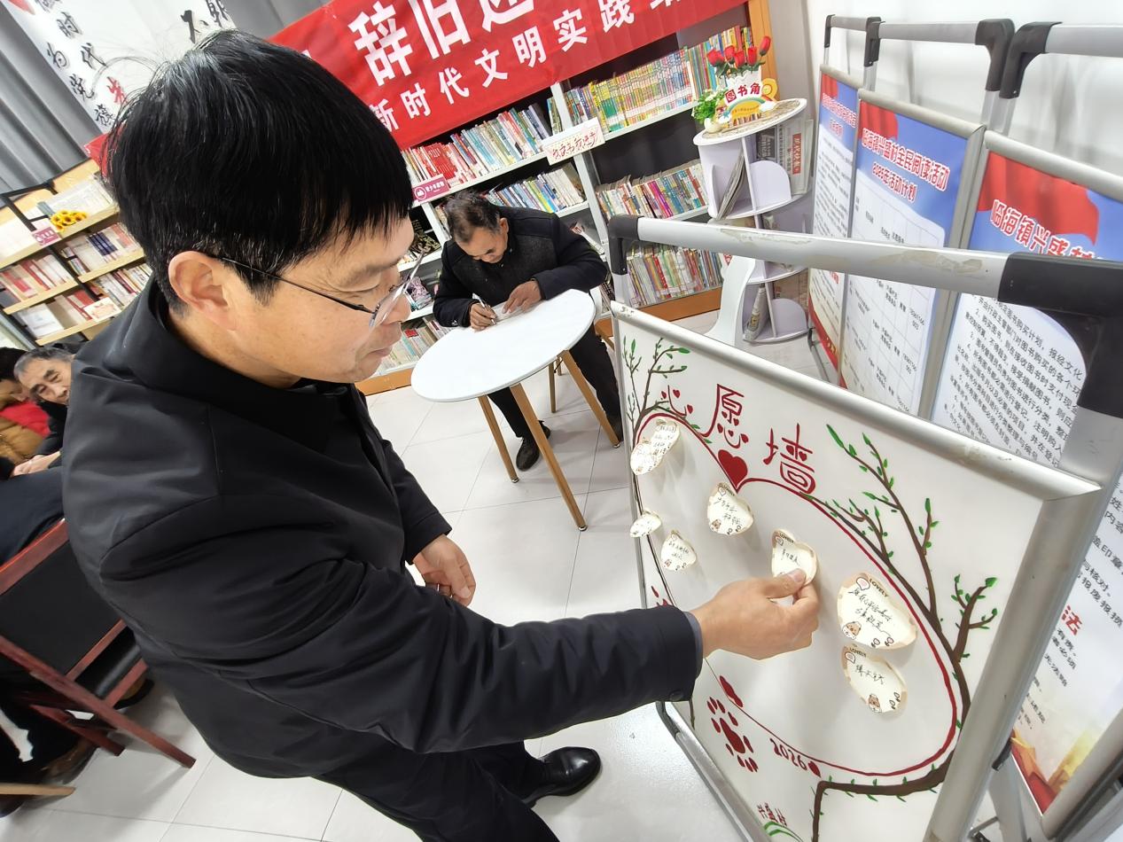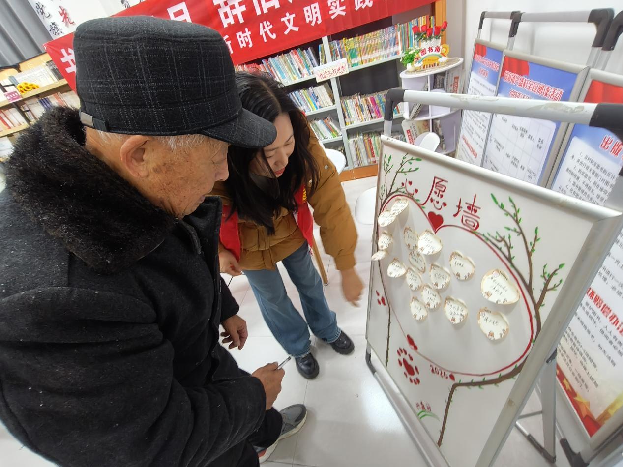 除了静心阅读,活动还设置了“心愿墙”互动环节。村民们拿起笔,在精致的卡片上写下新年心愿与美好期许,有的希望家人平安健康,有的期盼村里的产业发展更上一层楼,还有的立志新一年多读书、学知识。一张张承载着心愿的卡片被小心贴在心愿墙上,成为书屋里一道温暖的风景线。一位年过七旬的老党员感慨道:“这样的活动特别有意义,既让我们在书里学到了东西,又能和邻里一起迎接新年,心里特别踏实。”