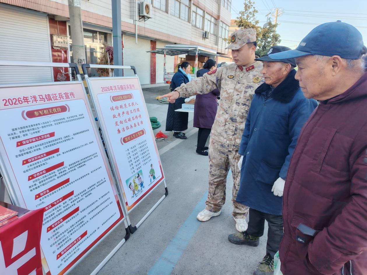 为扎实推进2026年征兵工作,广泛动员优质适龄青年投身国防建设,连日来,射阳县洋马镇武装部通过赶大集和镇、村(居)、企业各种会议,发放征兵内容宣传册、展板解读、广播播报等形式,把征兵政策精准送到千家万户,全域营造“参军光荣、报国无悔”的浓厚氛围。图为赶大集征兵宣传活动现场。(许爱法 冯小雨 摄)
