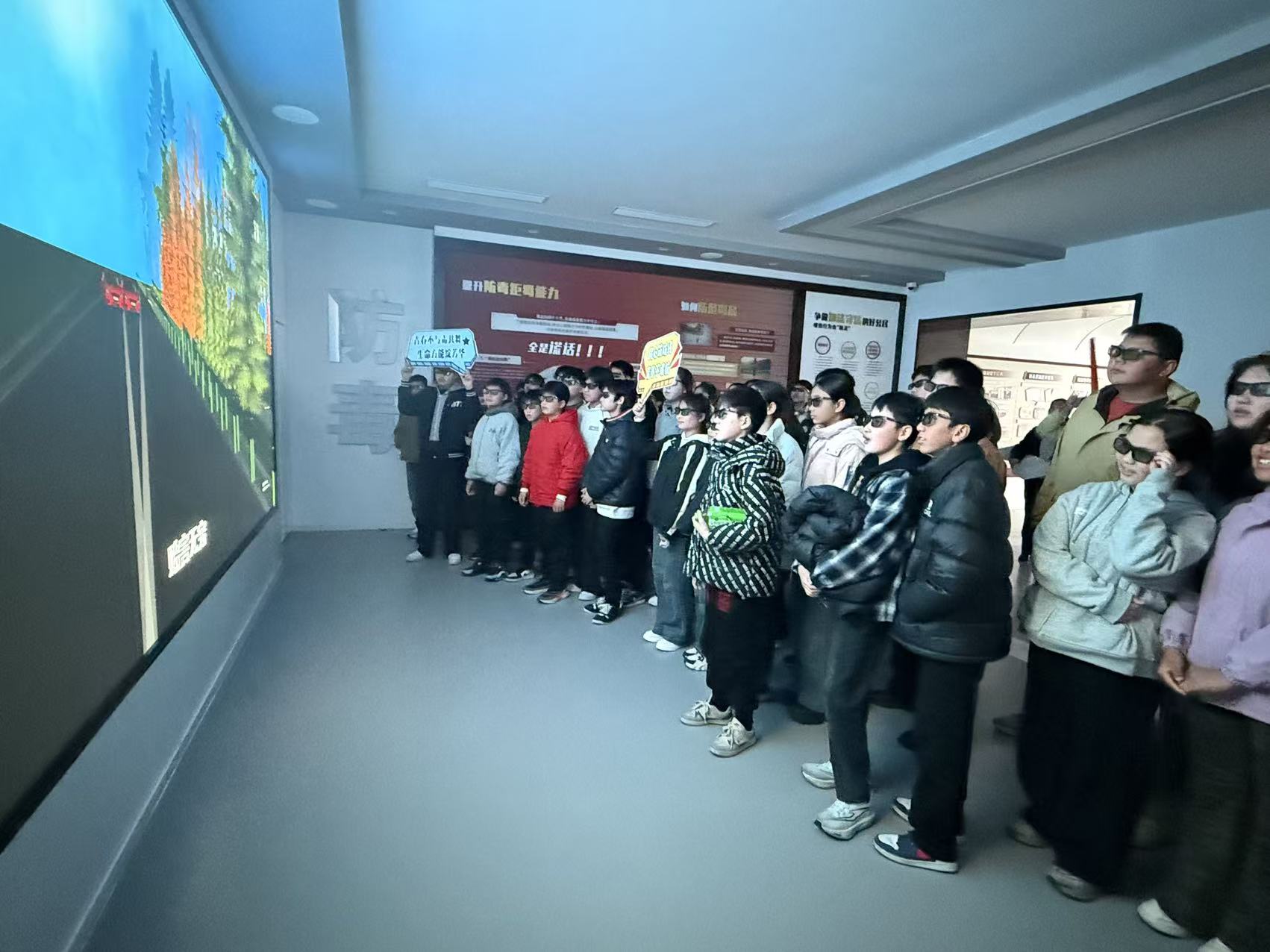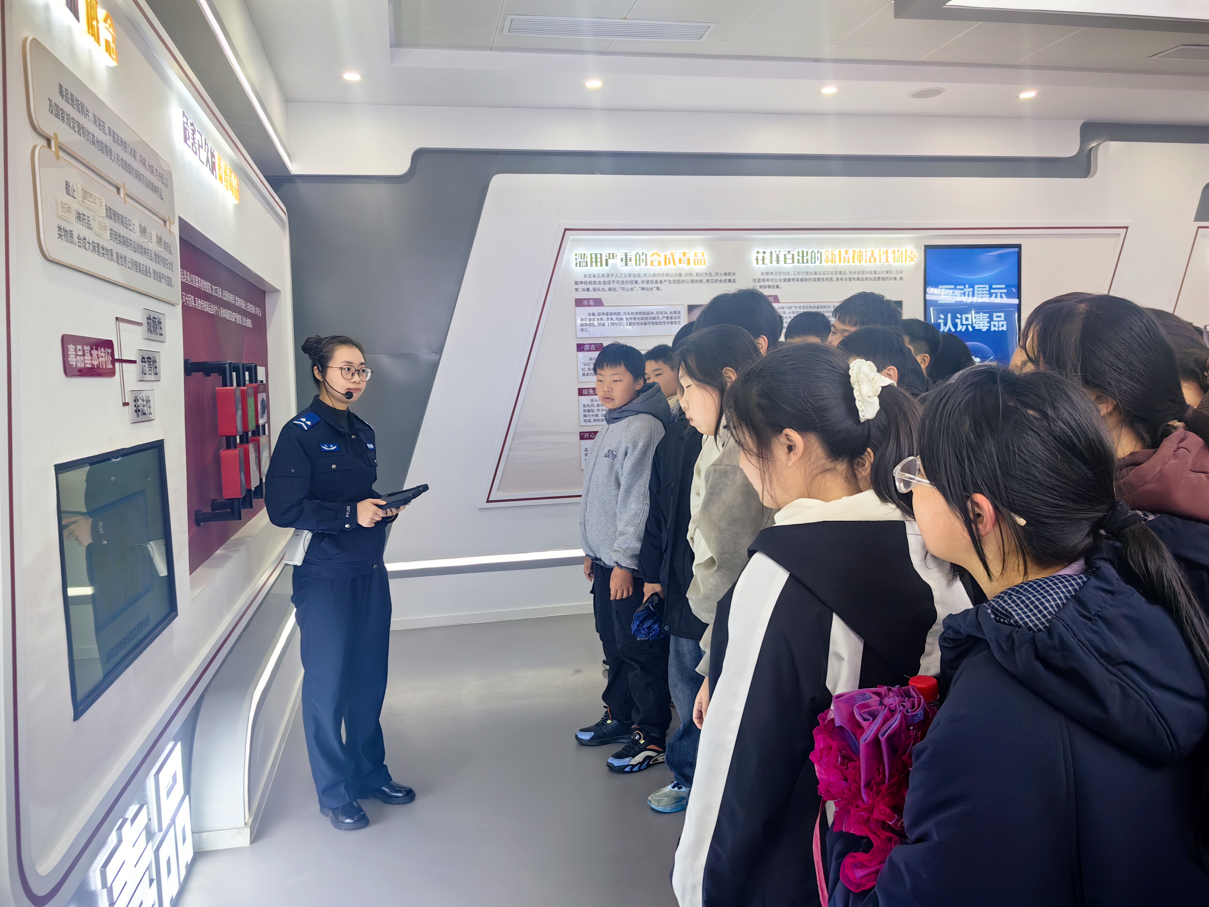 “大家看到的这些看似普通的‘奶茶粉’‘跳跳糖’,其实是极具伪装性的新型毒品……”在基地展厅,民警讲解员何熠通过实物展示、案例分析相结合的方式,深入浅出地讲解了毒品的种类、危害及相关法律法规,重点揭示了新型毒品的隐蔽陷阱和识别技巧。在互动体验区,同学们借助VR技术,身临其境地感受了吸毒后的幻觉、机体损伤及毒驾失控等场景,直观震撼的视觉冲击,让大家深刻认识到毒品对个人、家庭及社会的毁灭性伤害。