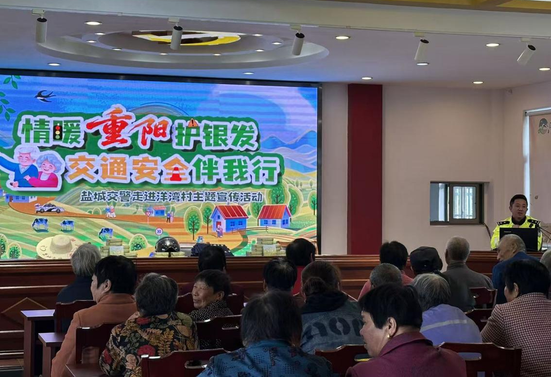 为切实提高老年人群体的交通安全意识,有效预防和减少涉老道路交通事故的发生,10月29日,盐城交警携手亭湖区南洋镇新时代文明实践所走进洋湾村,开展了“情暖重阳护银发交通安全伴我行”主题宣传活动,为村里的老人们送上一份特殊的“节日礼物”。