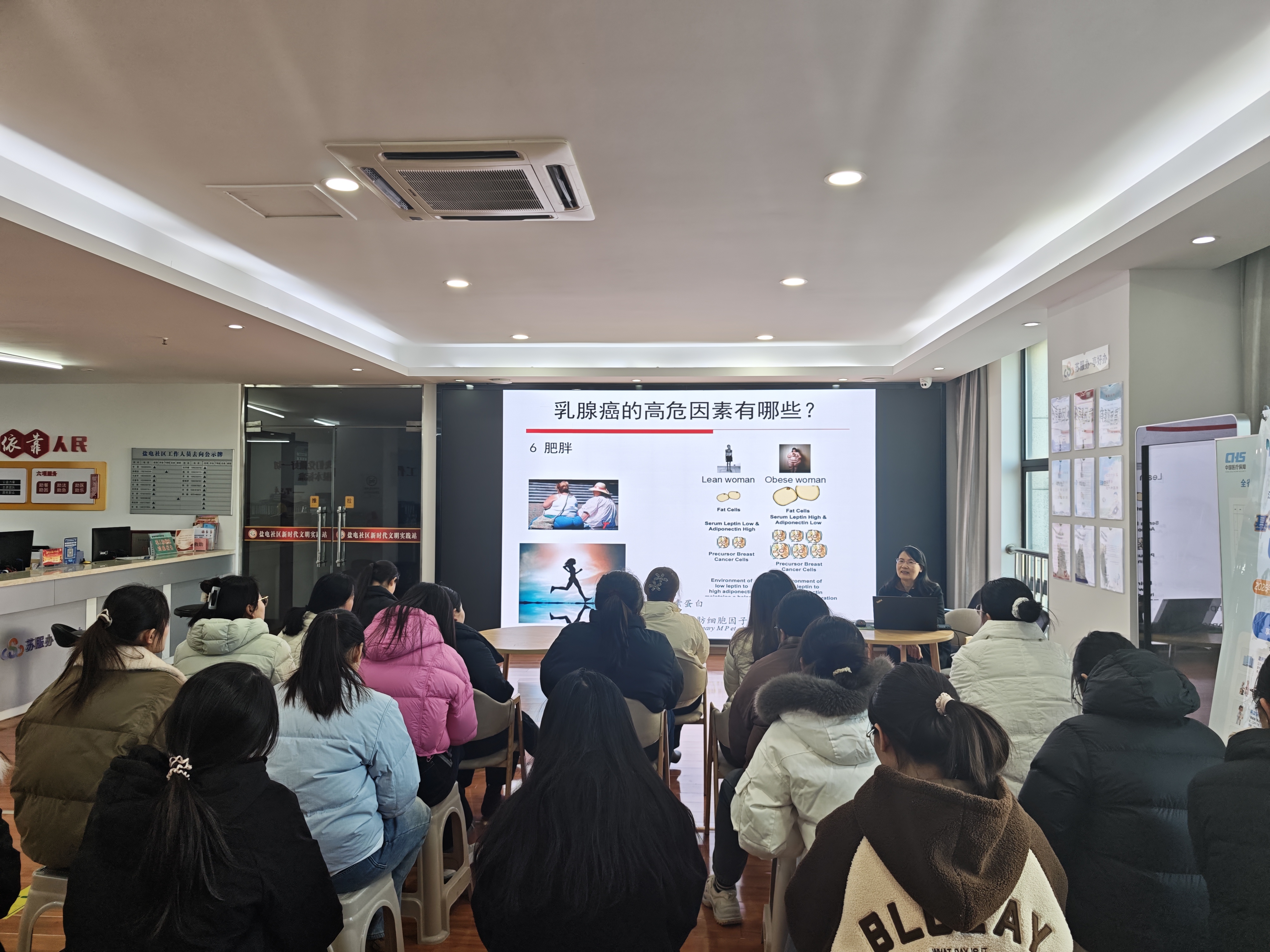 讲座现场,盐城市妇幼保健院的专家以浅显易懂的语言,深入解读了乳腺癌的高危因素。从“未生育、未哺乳,12岁前初潮、35岁后初产”等生育相关风险,专家通过生动案例和直观PPT演示,使在场女性对乳腺癌的致病诱因有了清晰的认识。同时,专家结合权威数据图表,对比我国与发达国家乳腺癌患者5年生存率的差异,强调“早筛查、早诊断、早治疗”是提高生存率的关键。